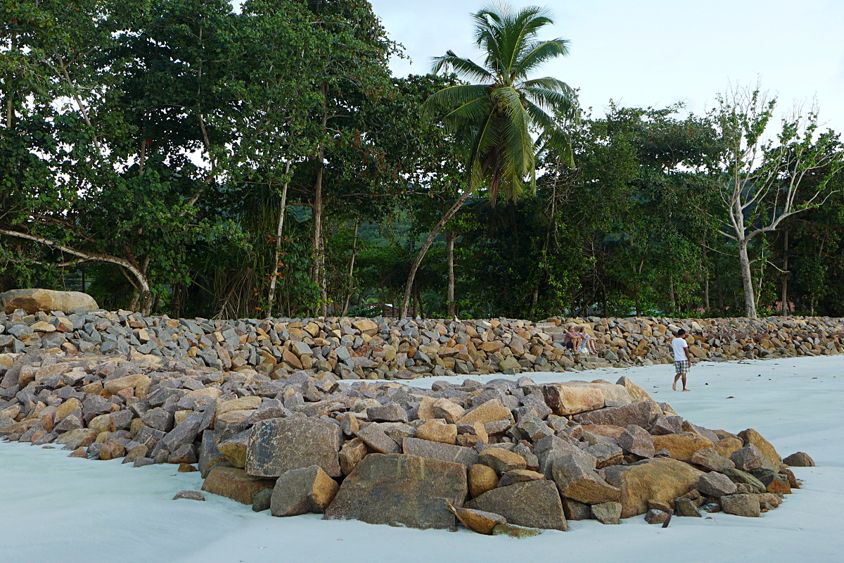 Die wassernahen Hölzer hat man entfernt und große Strecken des Küstenabschnittes mit Granitblöcken gesichert.