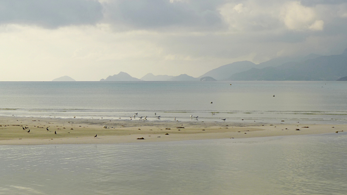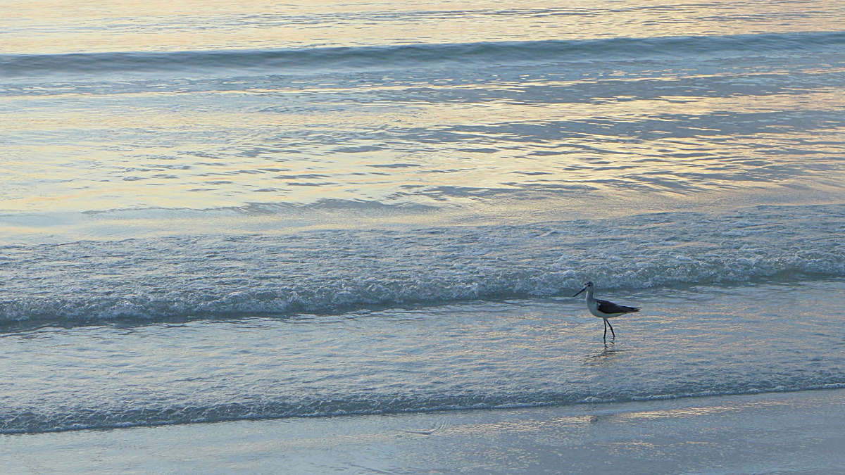 Bei Ebbe kann man unten auf einer großen sehr festen sandigen Fläche laufen und Wasservögel beobachten, dieser etwas größere auffällige Vogel müsste Tringa nebularia ( > Grünschenkel, der in Mittel- und Nordeuropa brütet) im Winterquartier sein. Der Vogel ist in einem meiner Bücher abgebildet, die Färbung und der leicht nach oben gebogene Schnabel stimmen mit den Abbildungen sehr gut überein.