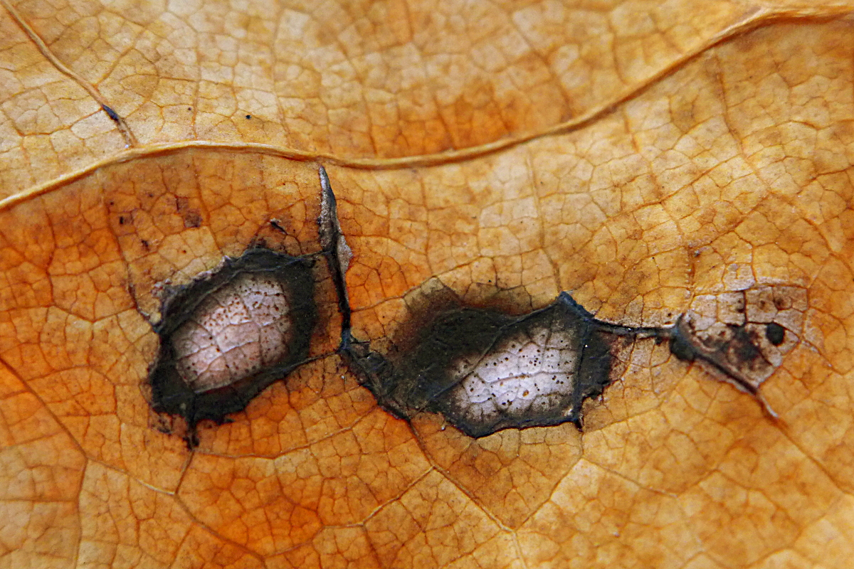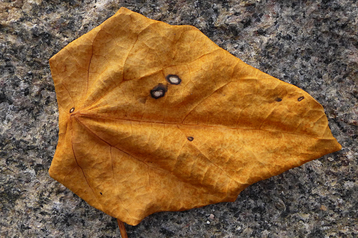 Ein für mich außergewöhnlicher Pilz, eine Blattfleckenkrankheit. Die Flecken erinnert an Cercospora, hier auf einem abgefallenen Blatt von > Hernandia nymphaeifolia. Ich wusste gar nicht, dass die trockenen Blätter der Art so eine leuchtende Farbe annehmen.