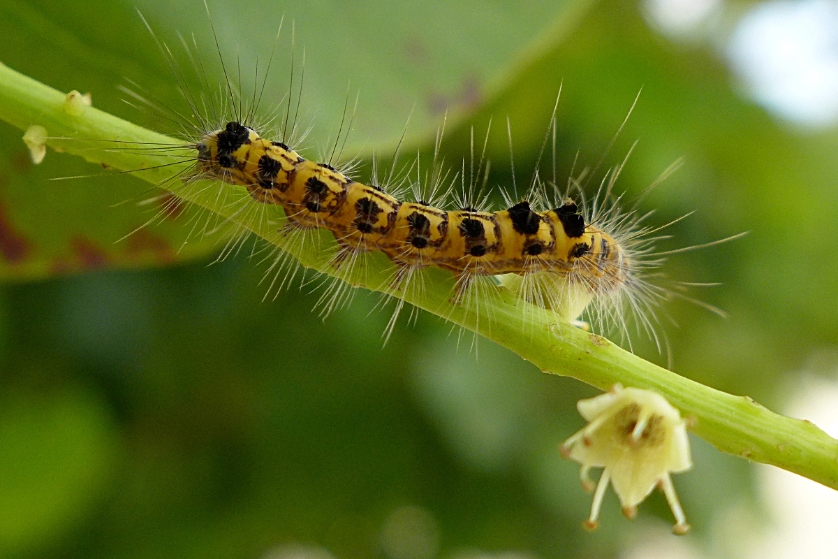 Die Raupe hat ein sehr großes Nahrungsspektrum: viele Strandbäume und auch Obstbäume in Gärten, Sträucher und Waldbäume werden angefressen. Die Brennhaare - die überall dort dann herumliegen/-fliegen sind extrem unangenehm, es kommt zu langanhaltenden juckenden Pusteln (Euproctis-Dermatitis).