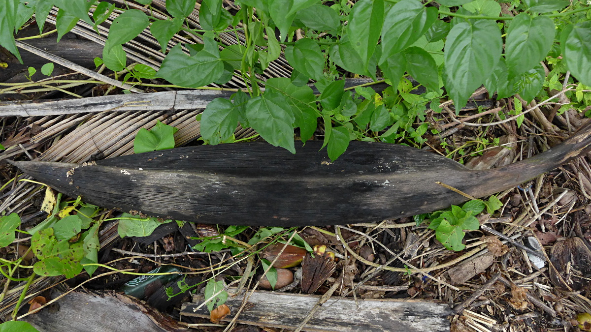 Allerlei liegt herum ... neben leeren Bierdosen (tse-tse-tse) eine alte feuchte geschwärzte Spatha (Hüllblatt des Blütenstandes) einer Kokospalme, darauf ist etwas Gelbliches getüpfelt.