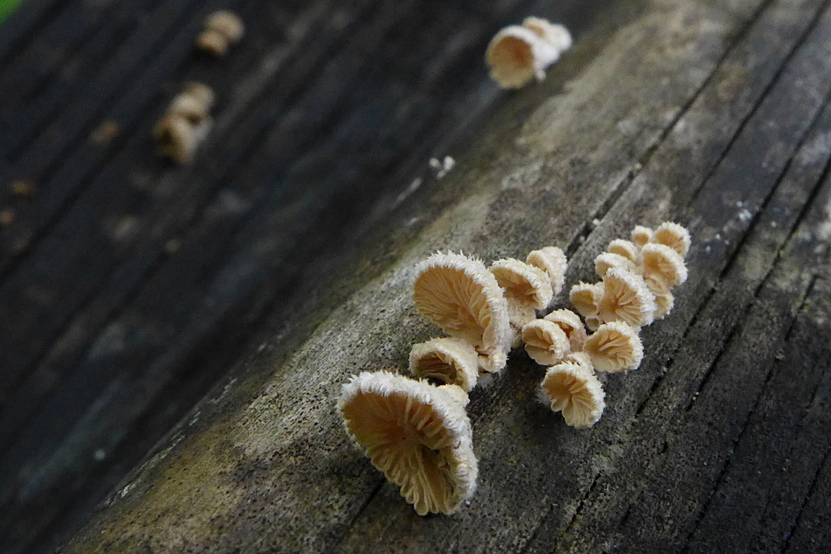 Es sind winzig kleine Spaltblättlinge, Schizophyllum commune - auch in den Tropen einer der häufigsten Pilze