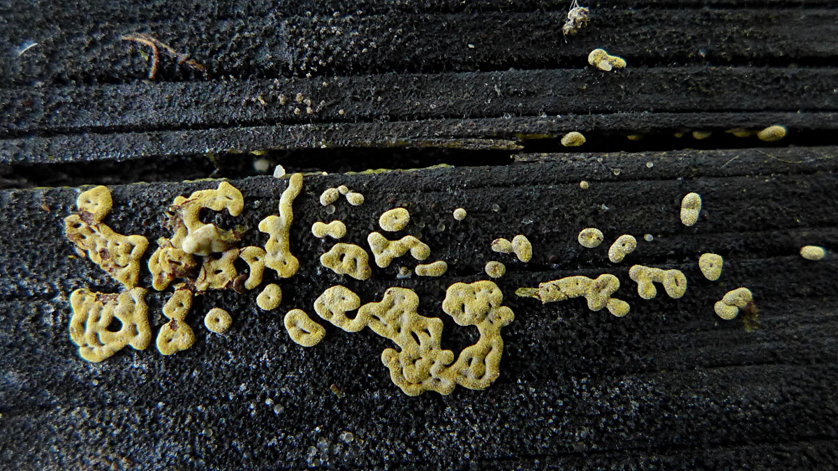 Ich hatte mit Becherchen gerechnet, aber es ist ein winziger gelblicher reifer Schleimpilz mit typischer Form, so dass ich den Fund Hemitrichia serpula (Netzschleimpilz) nennen möchte (pers. Erstfund).