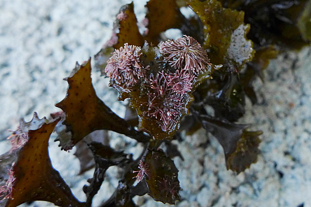 Hier fand ich es interessant, wie eine Rotalge (ein koralline Algenart, d.h. sie ist hart, weil sie Kalk einlagert - cf. Jania spec. ... nach Bildvergleich, so ganz zart und verzweigt) auf einer Braunalge (Turbinaria cf. ornata, nach Buch) wächst. In Kreol Seselwa (Seychellen-Kreolisch) ist das alles (alle Algen, alle Seegräser) "Gomon".