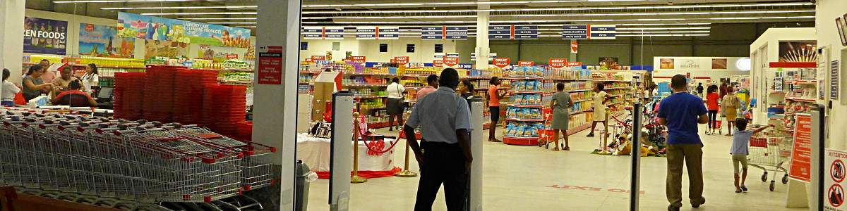 Hypermarket mit Wachmann (der breitbeinige Mann im Vordergrund, einer von mehreren)
