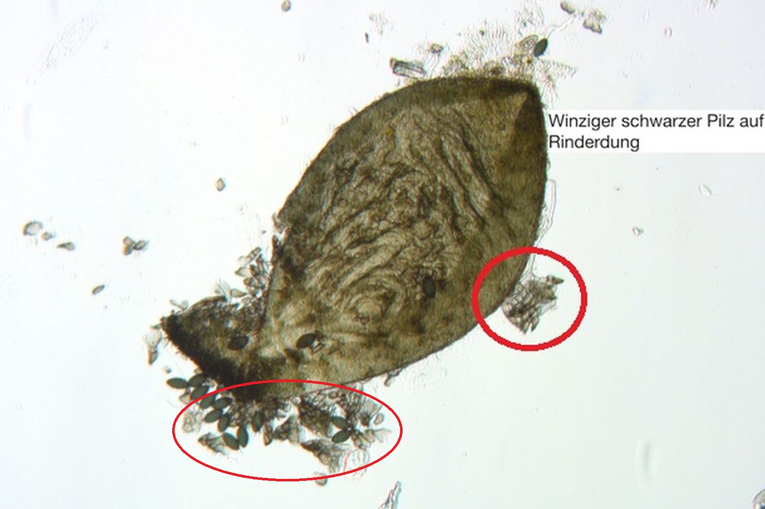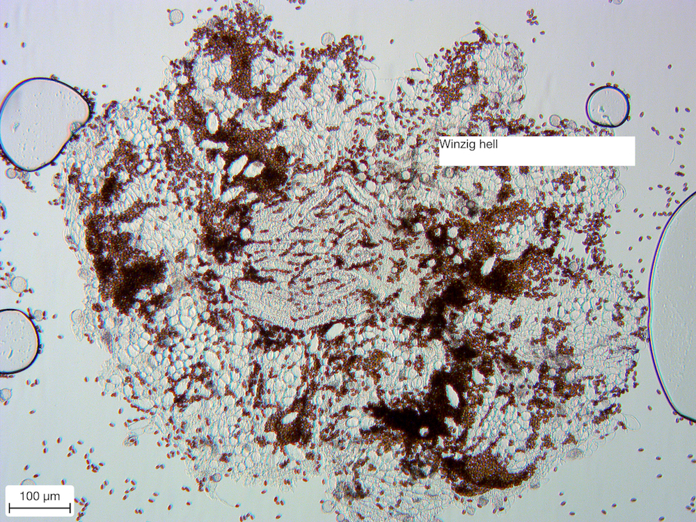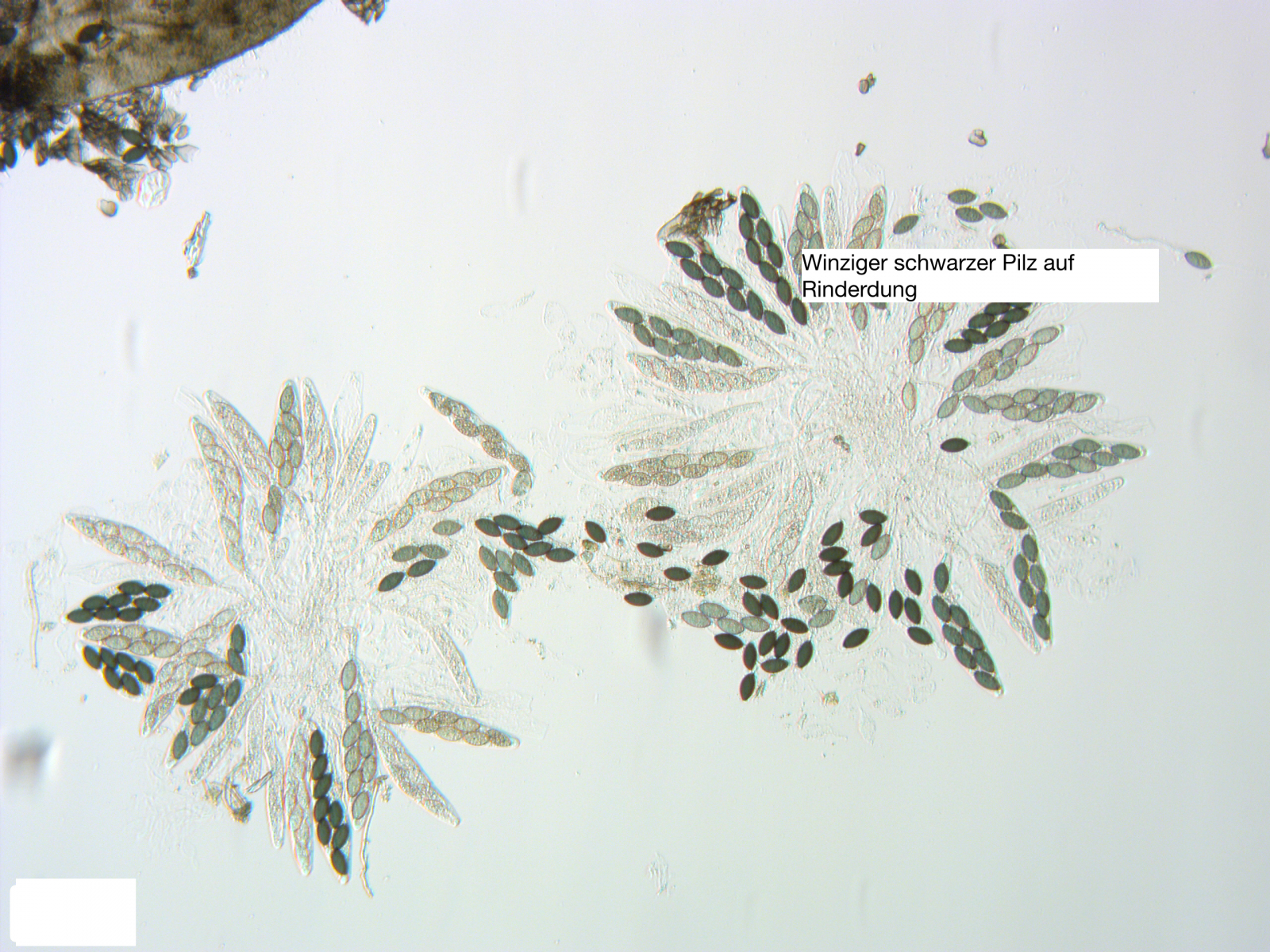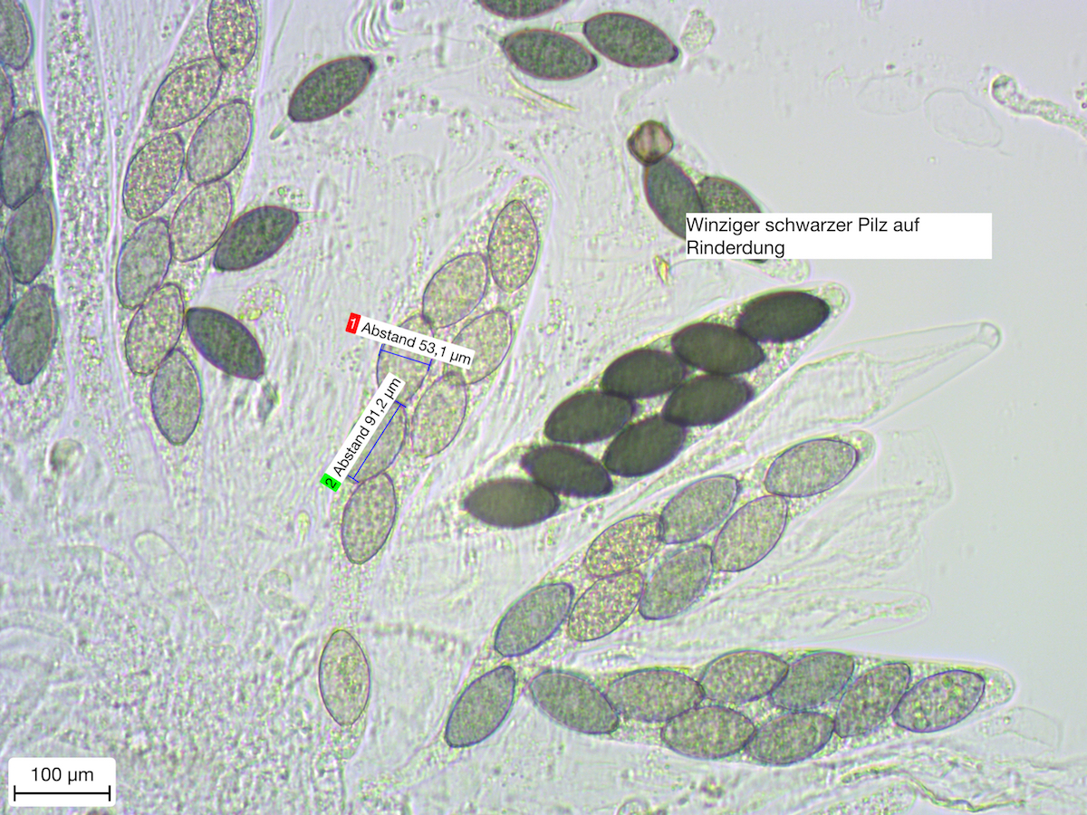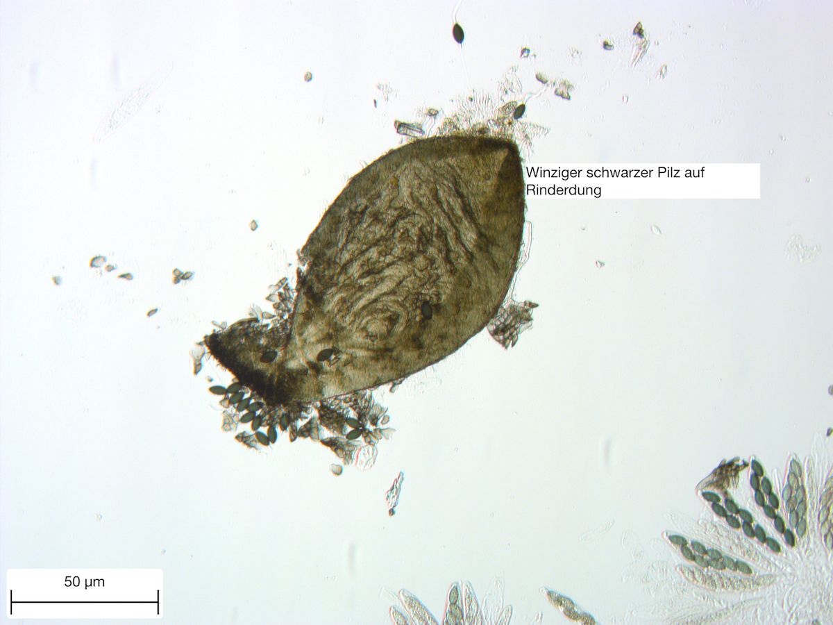 Ein Fruchtkörper war schwarz und sah ein bisschen aus wie ein ovaler Kohlenkrümel. Ich war nicht sicher, ob ich einen Pilz auf dem Objektträger platziere oder ein Fliegenei. Offenbar war es wirklich ein Pilz mit ziemlich großen Sporen. Hier die Bilder: