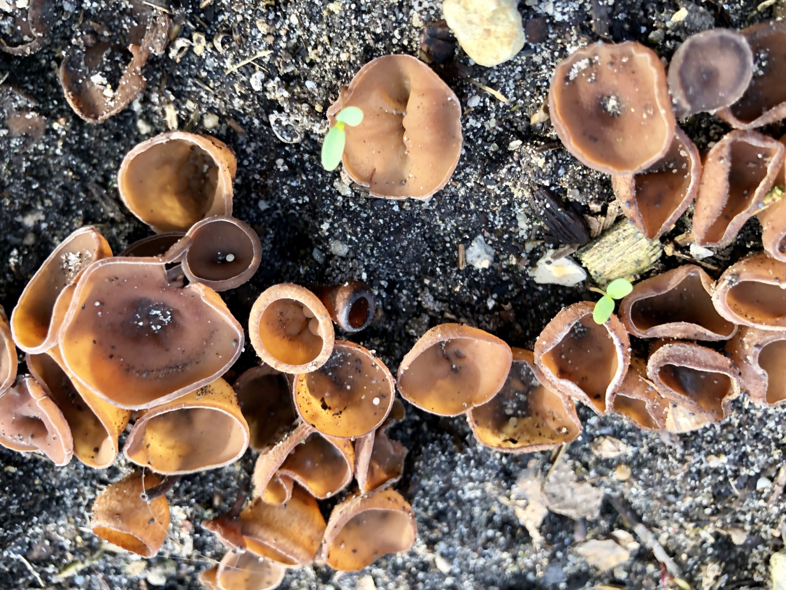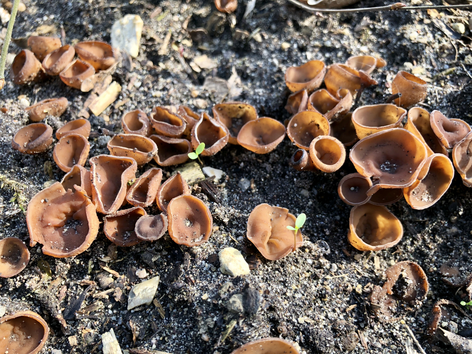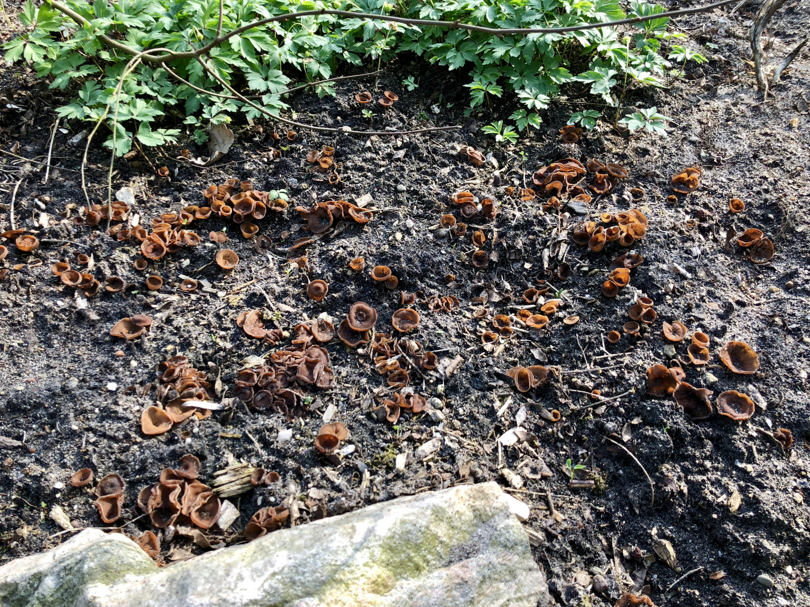 das sind Anemonenbecherlinge, im Hintergrund sieht man die Blätter der Buschwindröschen.