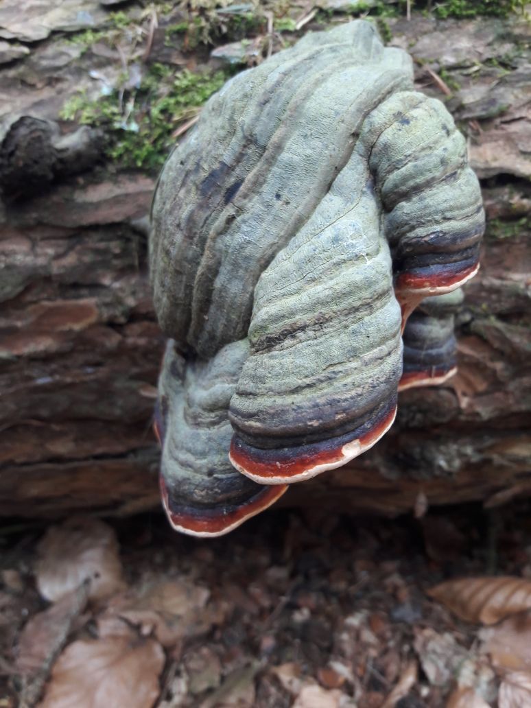Auf dem ersten Bild sind toll gewachsene FomPinis (Ratrandige Baumschwämme, Fomitopsis pinicola), mit schicker Ausprägung von Geotropismus.