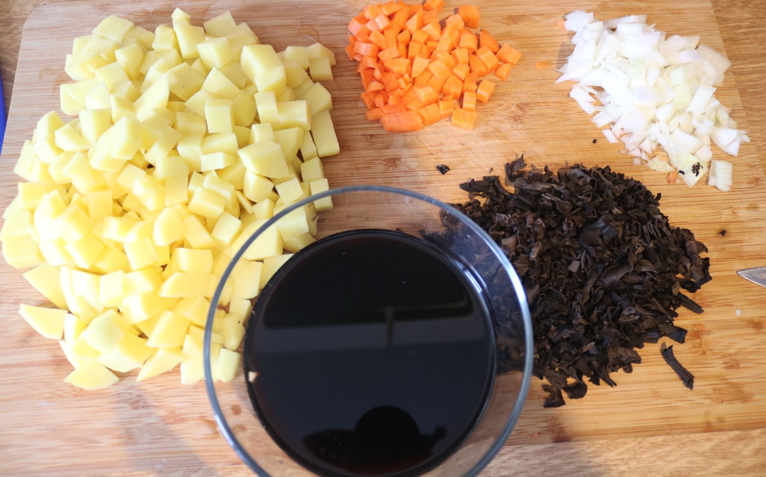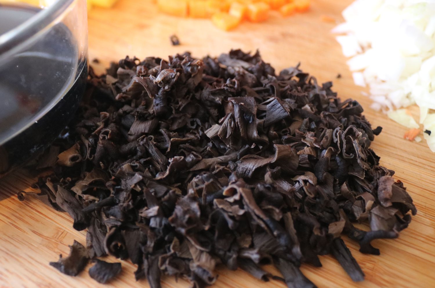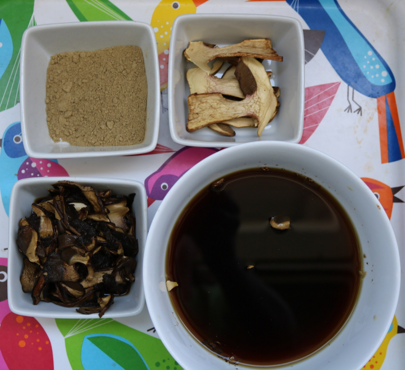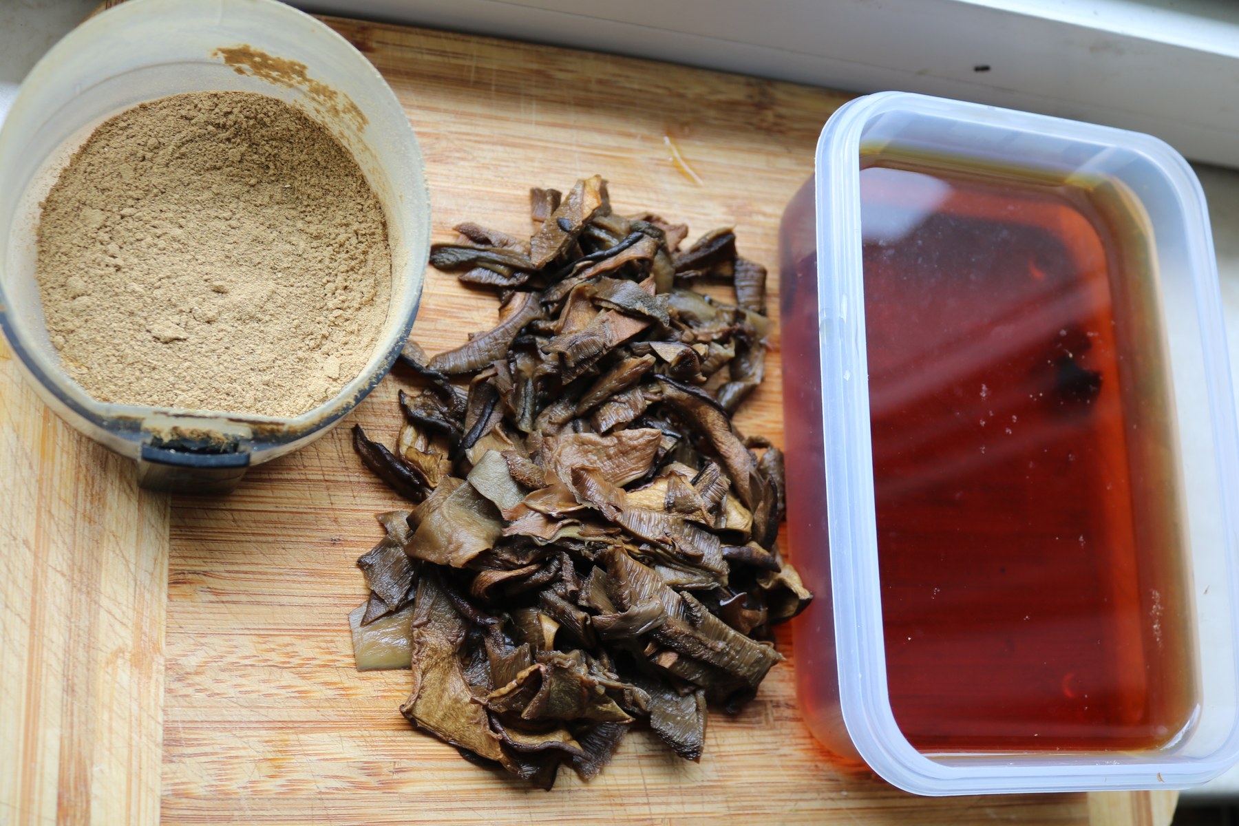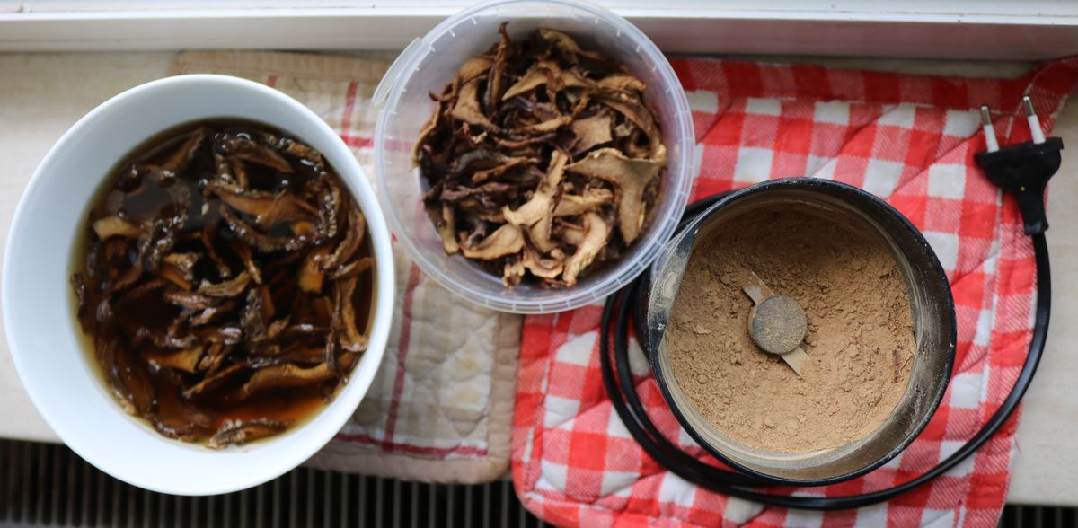 Großteil der Trockenpilz-Menge wurde über Nacht eingeweicht und gehackt, der Rest wurde zum Pulver zermalen und direkt un den Topf gegeben.