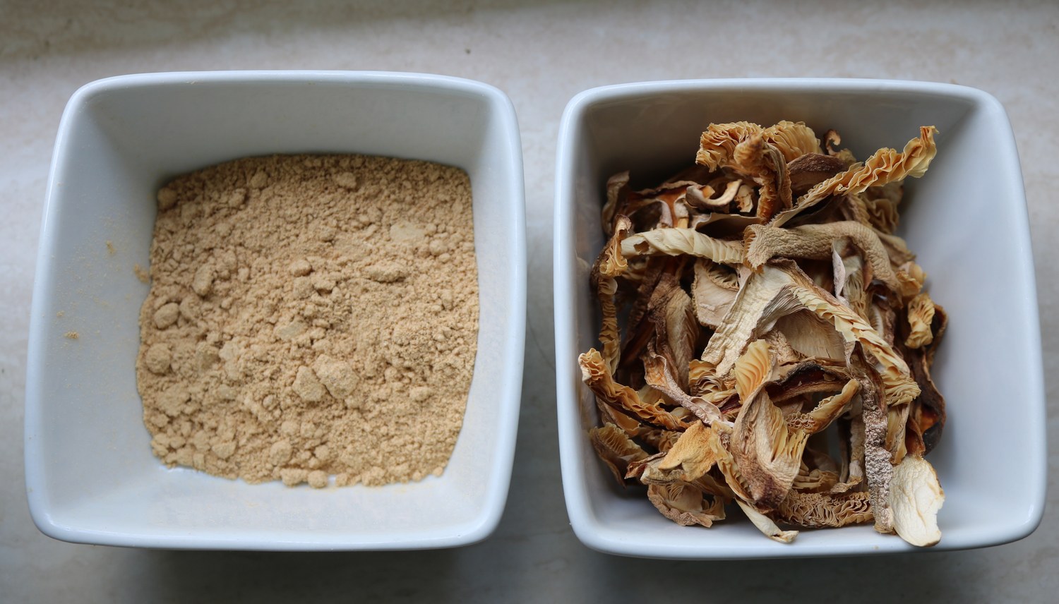 Pilzpulver und die getrockneten Stückchen:
