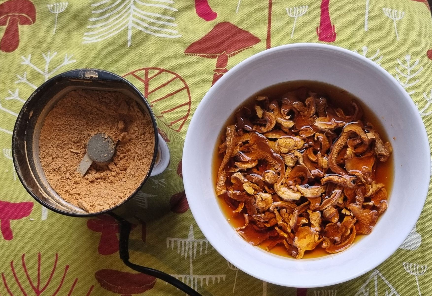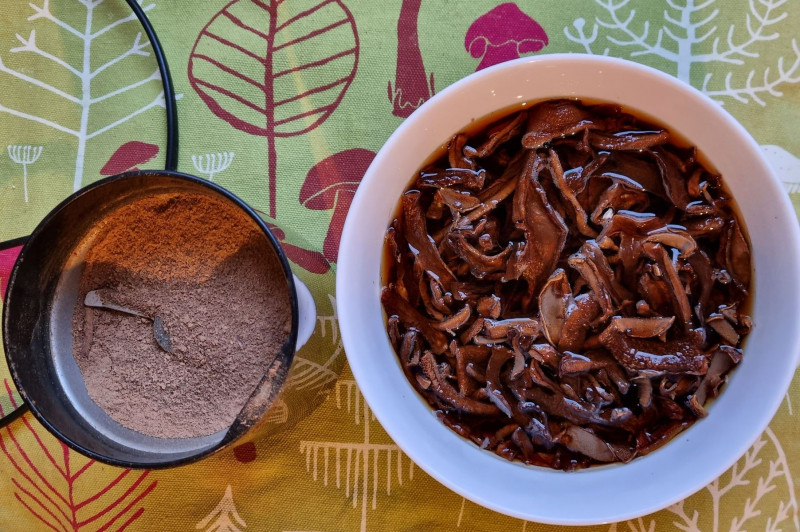 Pilzpulver und eingeweichte Pilze (leider am Abend mit künstlichem Licht fotografiert):