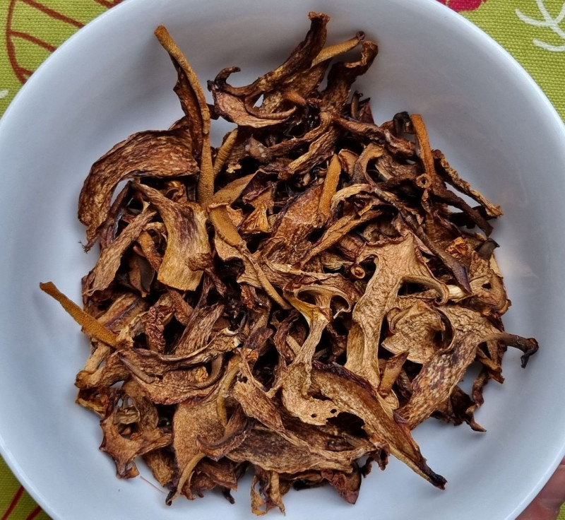 Zum Teil als Pilzpulver verarbeitet, zum Teil eingweicht. Einweichwasser ist schön gelbbräunlich.