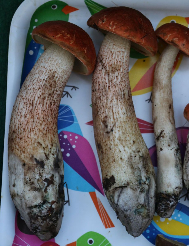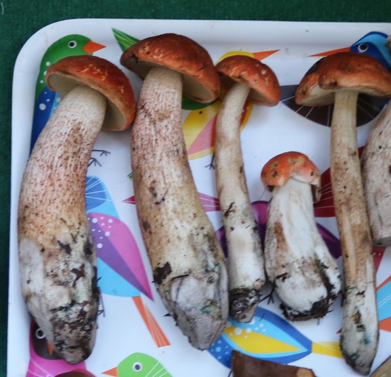 vielen Dank für diese interessante Anmerkungen! Tatsächlich kenne ich mindestens eine Stelle wo die beiden Arten auf mehreren hundert Meter scheinbar nebeneinander wachsen, jeweils mit mehreren Myzelien nehme ich an. Dort habe sie im Oktober mehrmals gesammelt, hier für das Bild nebeneinander gelegt (links 2x L. scabrum, rechts 3x L. cyaneobasileucum):