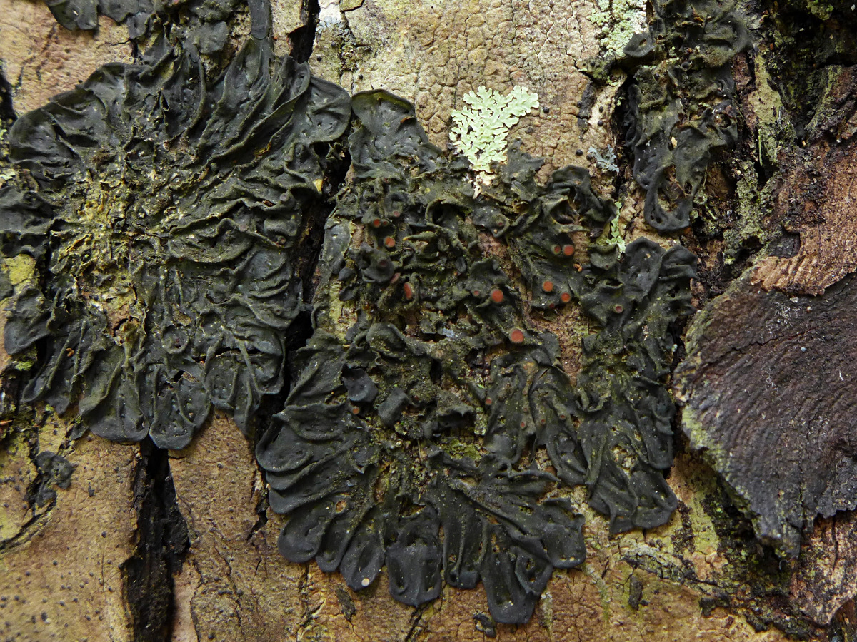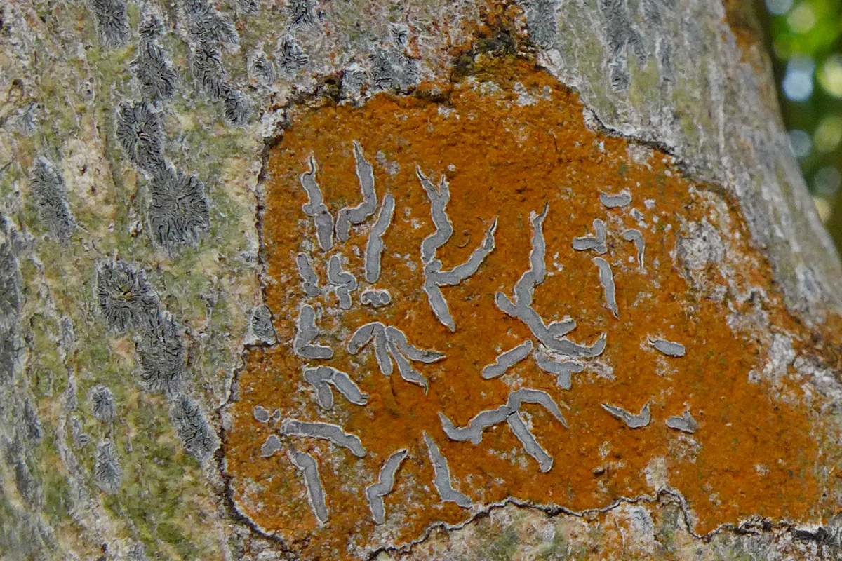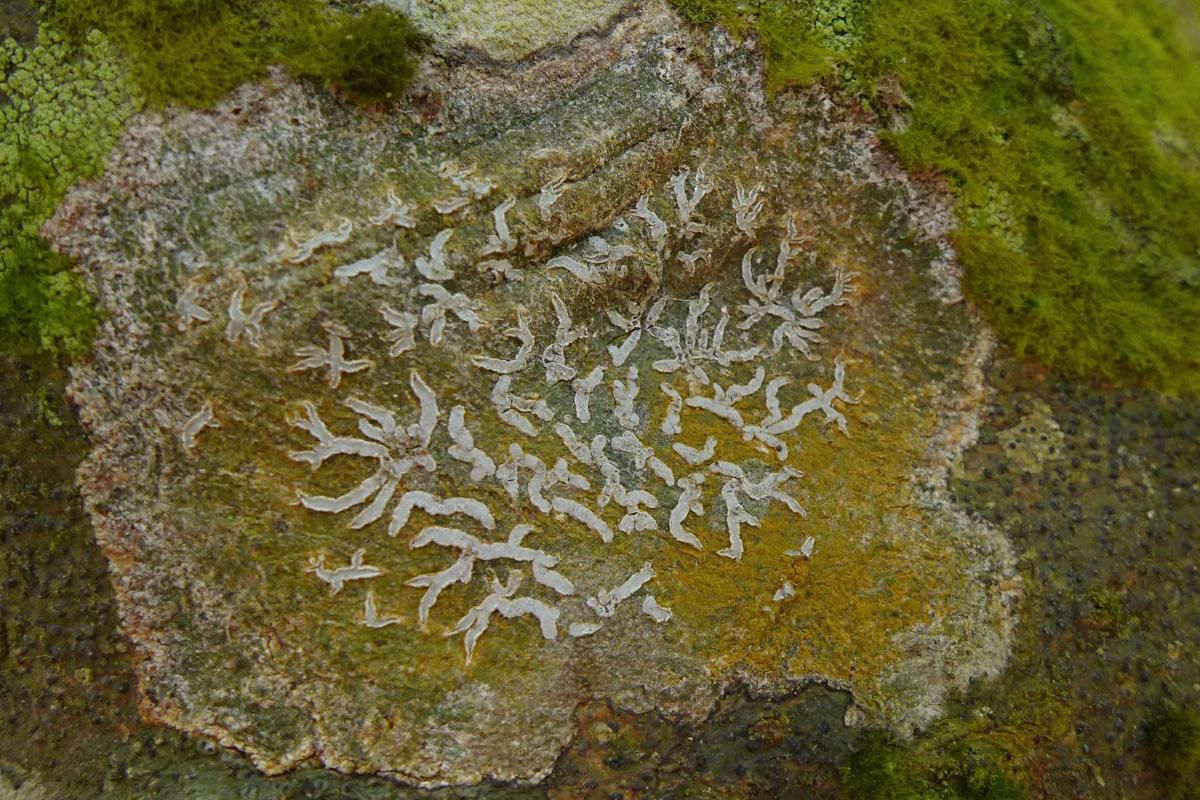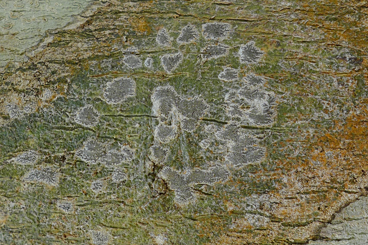 Einige der Flechten (82-87) gehören mit Sicherheit zu den Graphidaceae wie unsere Graphis scripta, bei der schwarzen Blattflechte mit den roten Apothecien (94) vermute ich, dass das in Richtung Collemaceae geht.