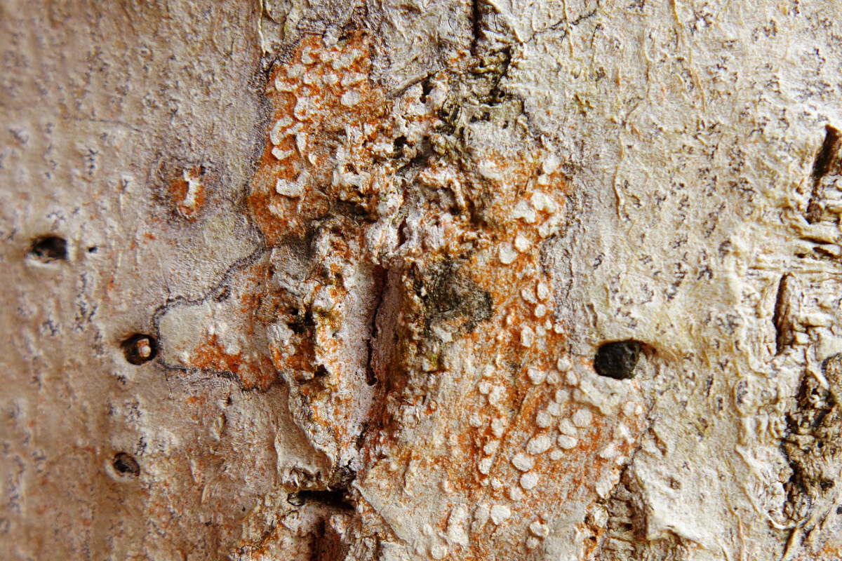Auf einem mitteldicken Laubholzast (Totholz) resupinat wachsende sehr grobporige helle Pilze (Poren sechseckig, ca 1 pro mm), sehr dünn, nicht ablösbar, keine Tendenz zur Hutbildung, Anfangsstadium so ein bisschen "plüschig" bräunlich-orange.