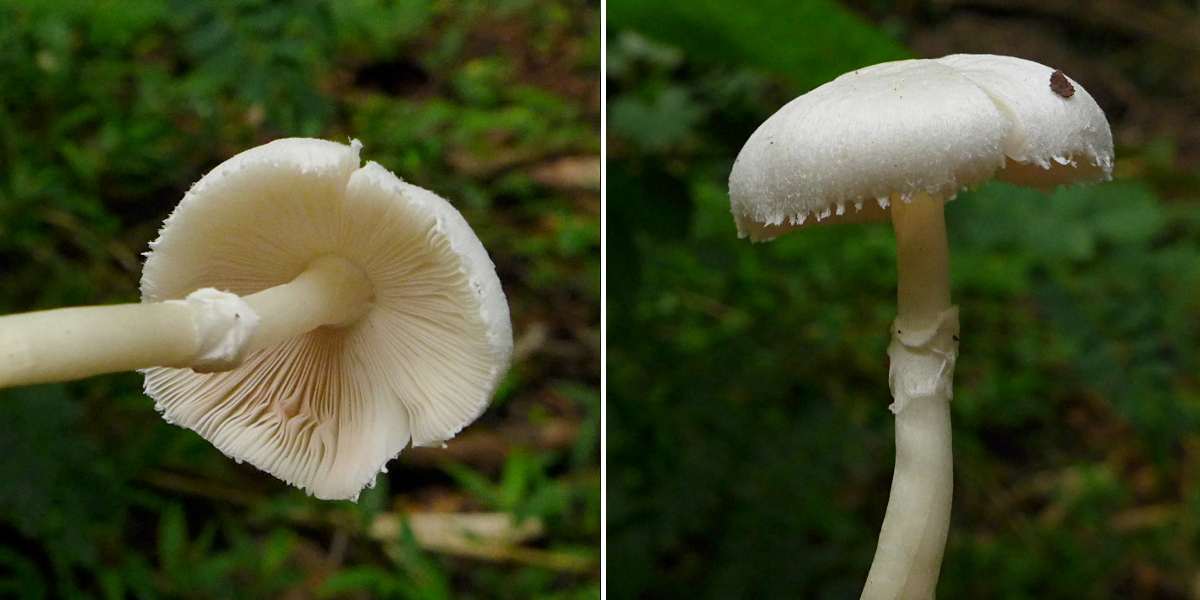 2 kleine Pilzchen, Hut ca. 2 cm breit, alles weiß, sehr engstehende Lamellen mit einer leichten rosafarb. Tönung an einer Stelle, deutlicher Ring ... sie haben mich verwirrt.