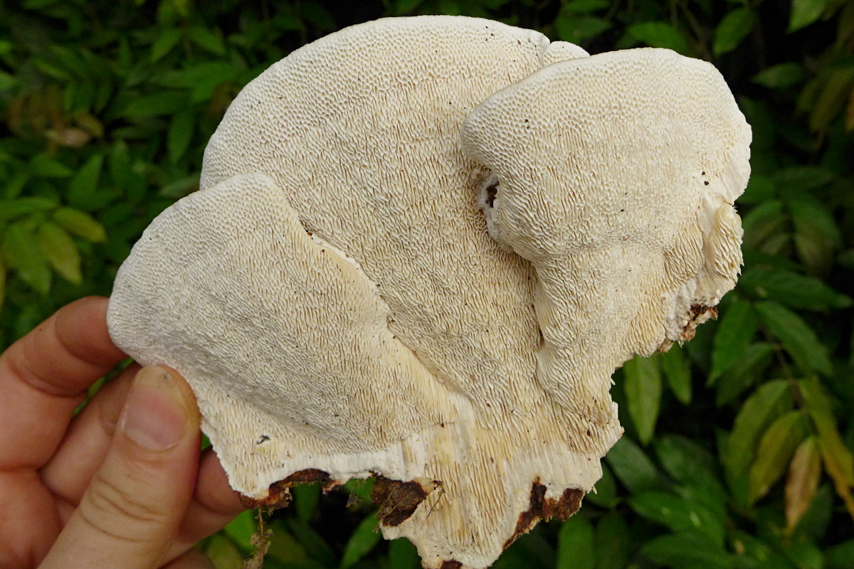 Solche Poren kenne ich bisher nur von Hexagonia, die würde aber (immer ?) Hüte ausbilden - und vor allem mit KOH schwärzen. Das tut der Pilz hier aber nicht.