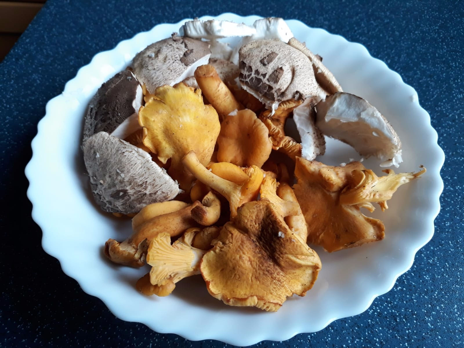 Heute allerdings die ersten Pfifferlinge gefunden...es waren geputzt gute 100 g - allerdings unter Zuhilfenahme von ein paar Schirmpilzen.