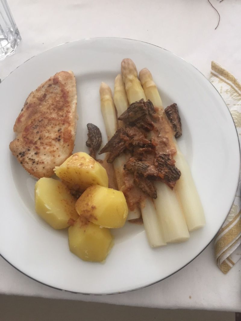 nachdem ich letzte Woche einige Spitzmorcheln finden konnte, gab es heute Hähnchenbrust mit Spargel und einer Morchelrahmsauce (zum .ersten Mal).