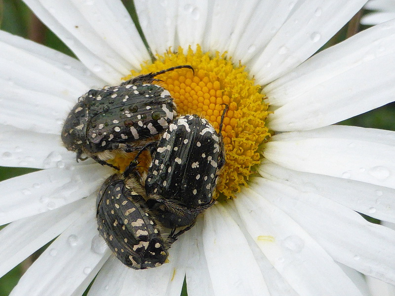 Die kleinen vor den drei "Rosenkäfern" auf der Margerite, sind das Bogenblättrige Helmlinge (Mycena speirea) oder sogar Rötlinge?