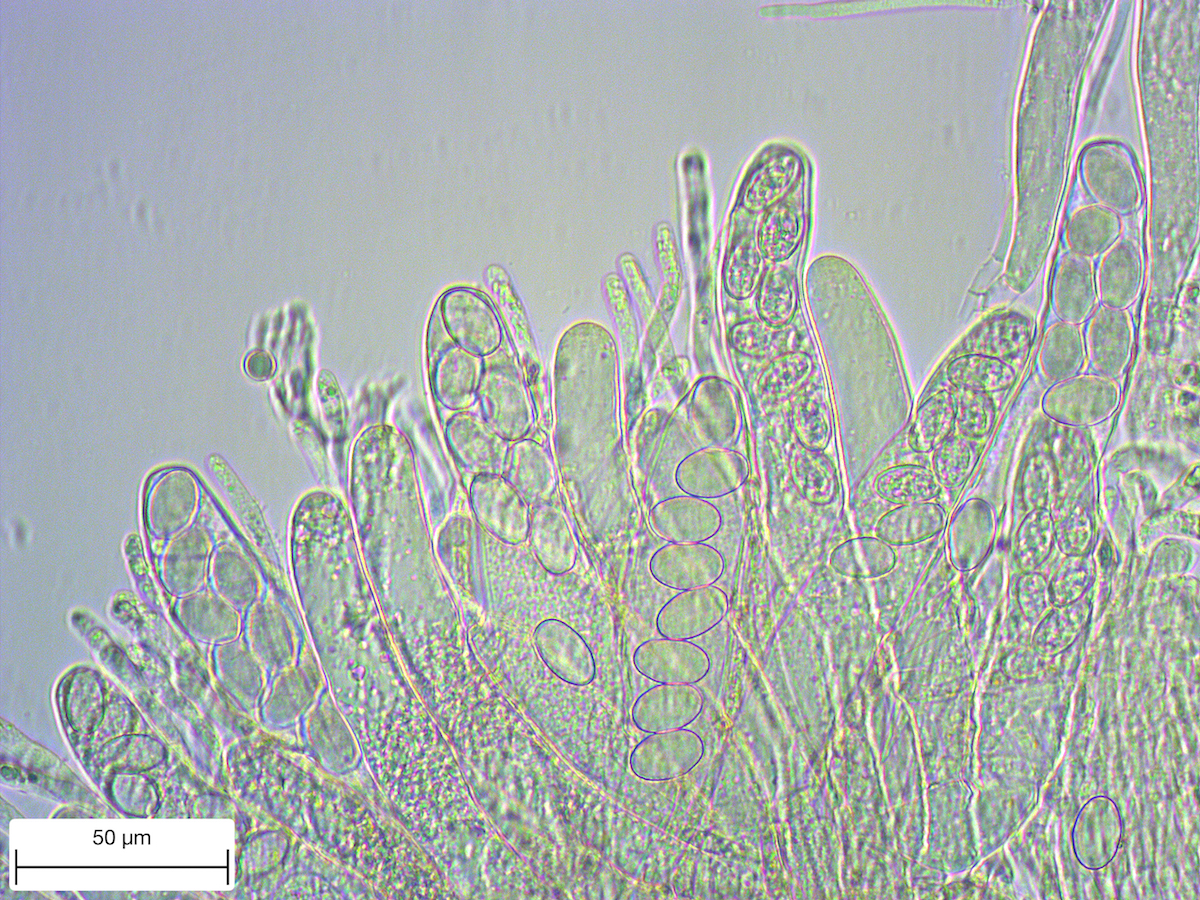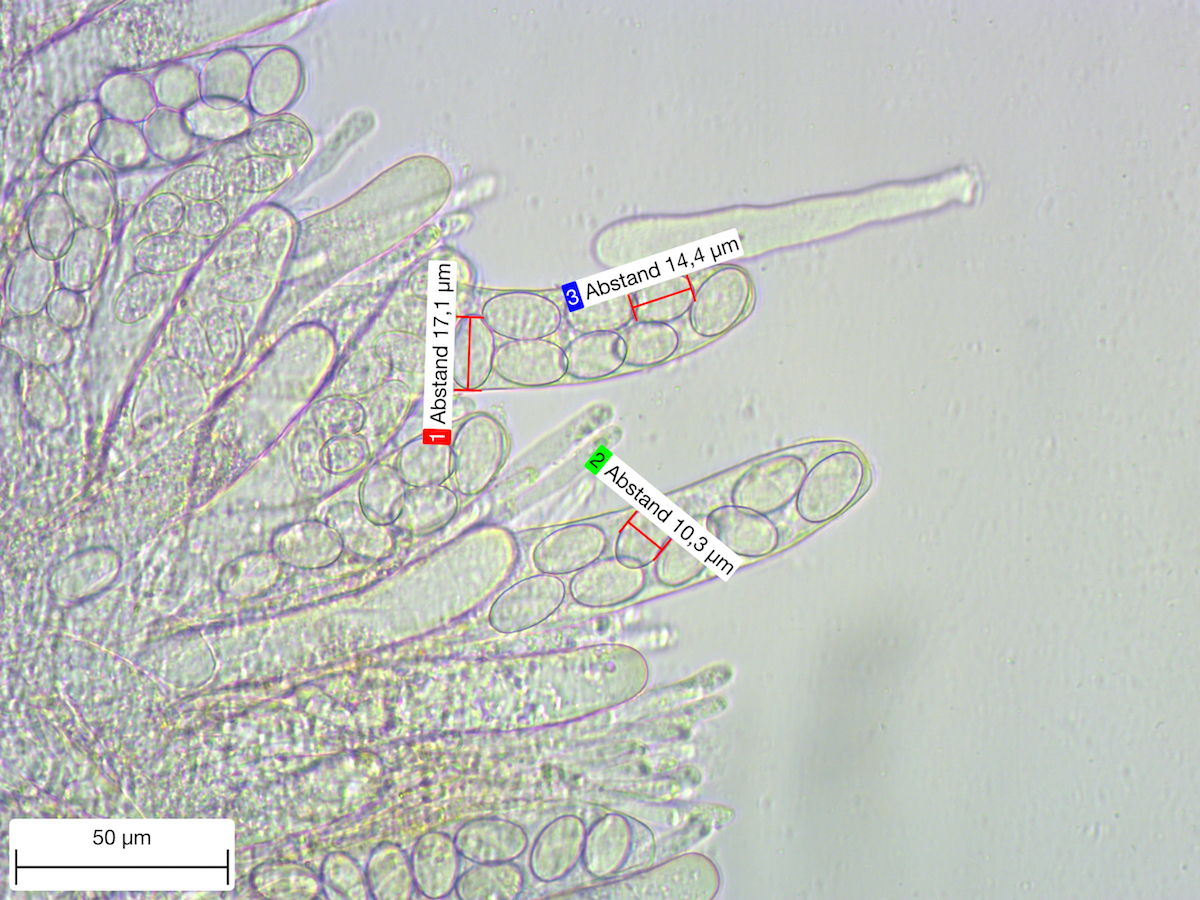 Zu den Mikro-Bildern habe ich eine Frage: Die größten Sporen sind klar und fast transparent. Bei den kleineren sind in den Zellen Strukturen erkennbar, die bei den großen nicht mehr zu sehen sind. Ich vermute, dass es sich um unreife Sporen handelt, oder? Und: Um welche Strukturen handelt es sich bei den dünnen langen Zellen zwischen den Asci?