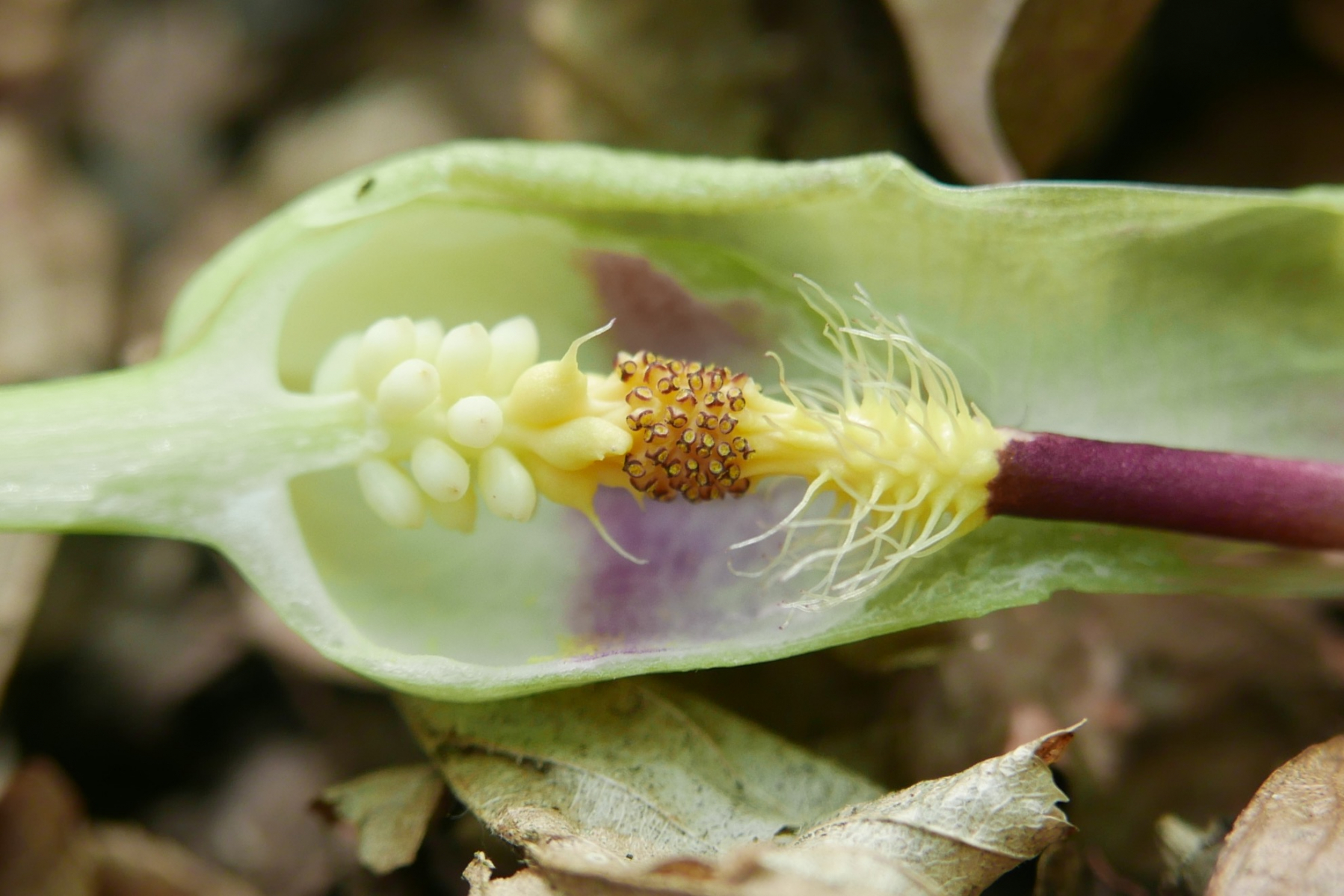Jetzt ist die Hauptzeit der Blüte des Aronstabs. Bei uns auf dem Waldgrundstück wächst der in großen Horsten zwischen den Bärlauchen. Letztes Jahr habe ich mal eine Blüte auseinandergenommen, da ist der Mechanismus der Fliegenfalle ganz gut zu sehen.