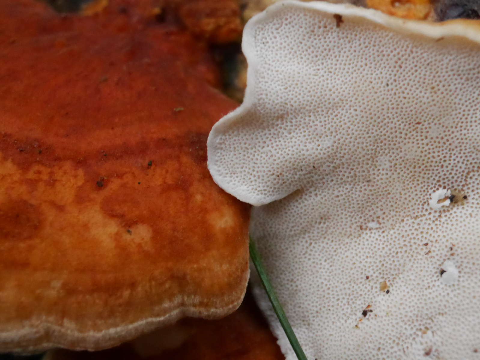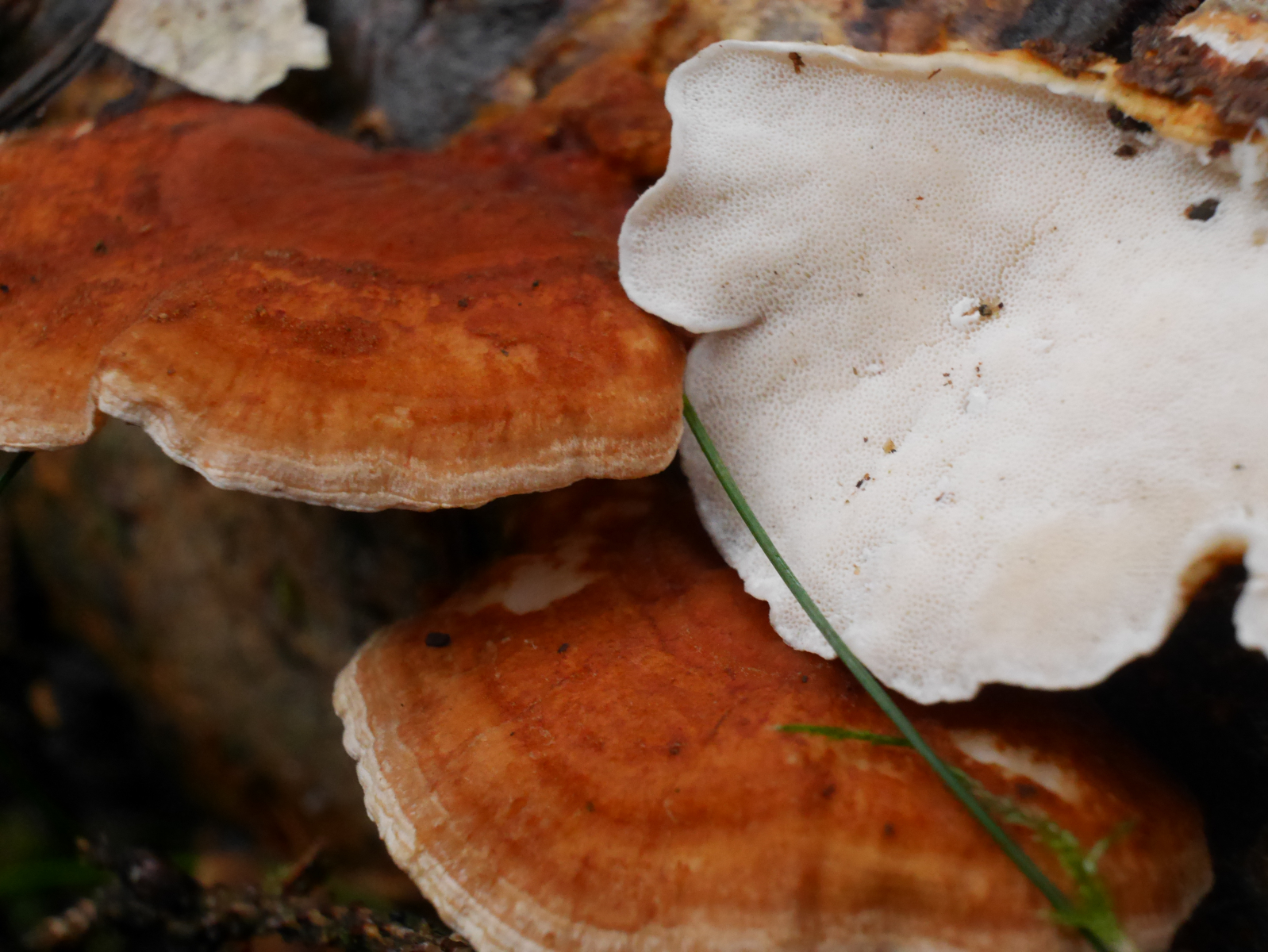 Die orange-braune, gezonte Hutoberfläche mutete samtig an. Zuwachskante hell, fast weiß. Poriges weißes Hymenophor, nicht druckempfindlich. Über Geruch und Geschmack kann ich leider keine Angaben machen.
