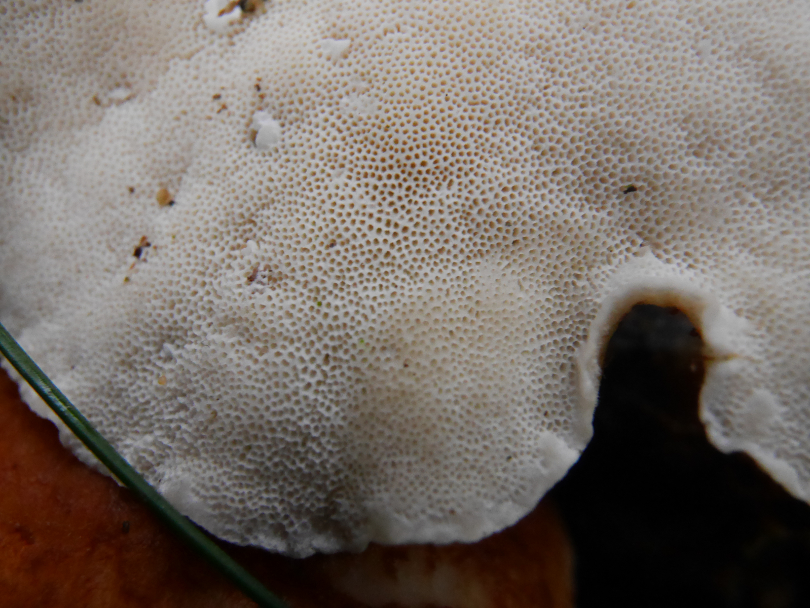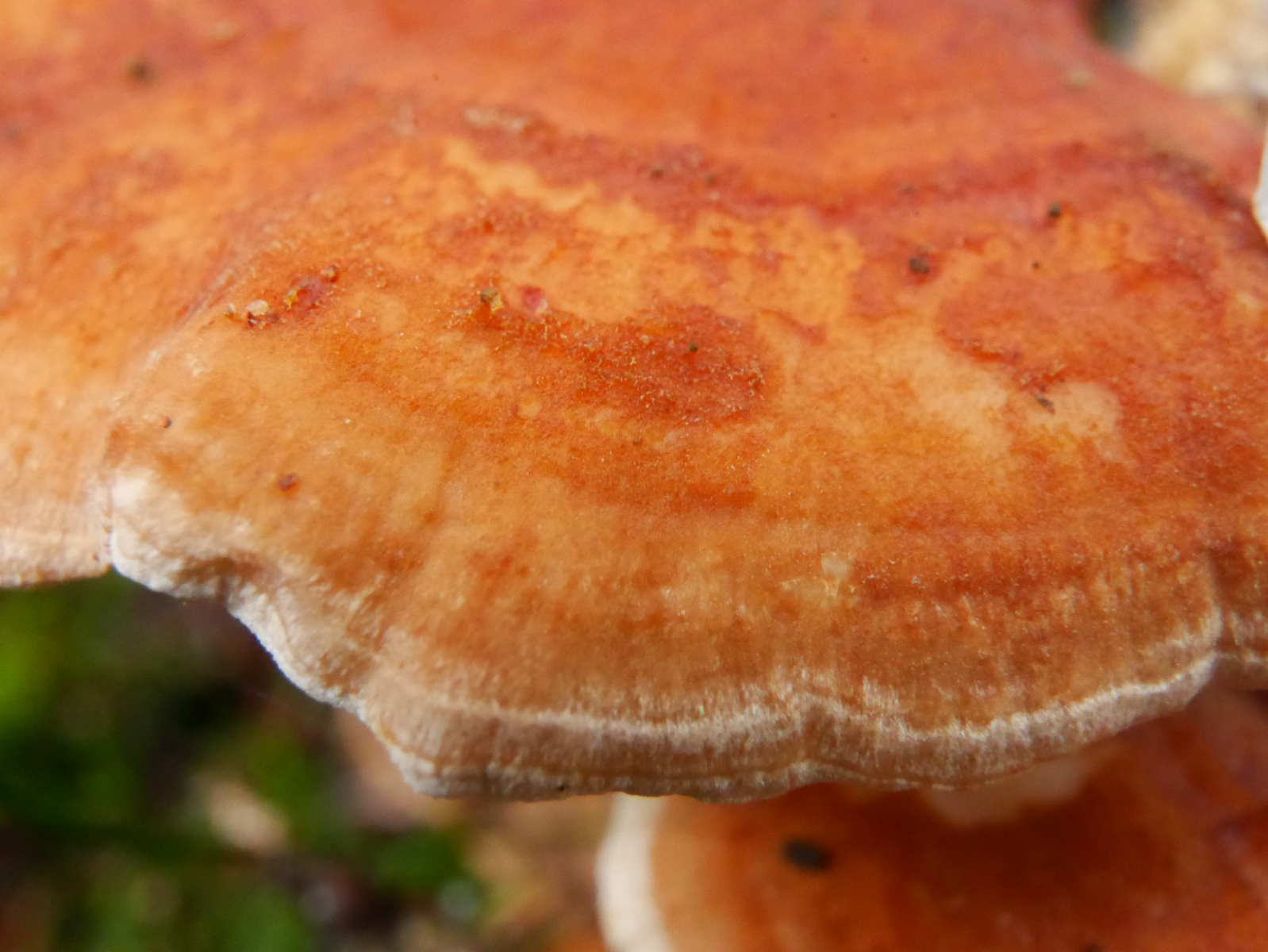 Die orange-braune, gezonte Hutoberfläche mutete samtig an. Zuwachskante hell, fast weiß. Poriges weißes Hymenophor, nicht druckempfindlich. Über Geruch und Geschmack kann ich leider keine Angaben machen.