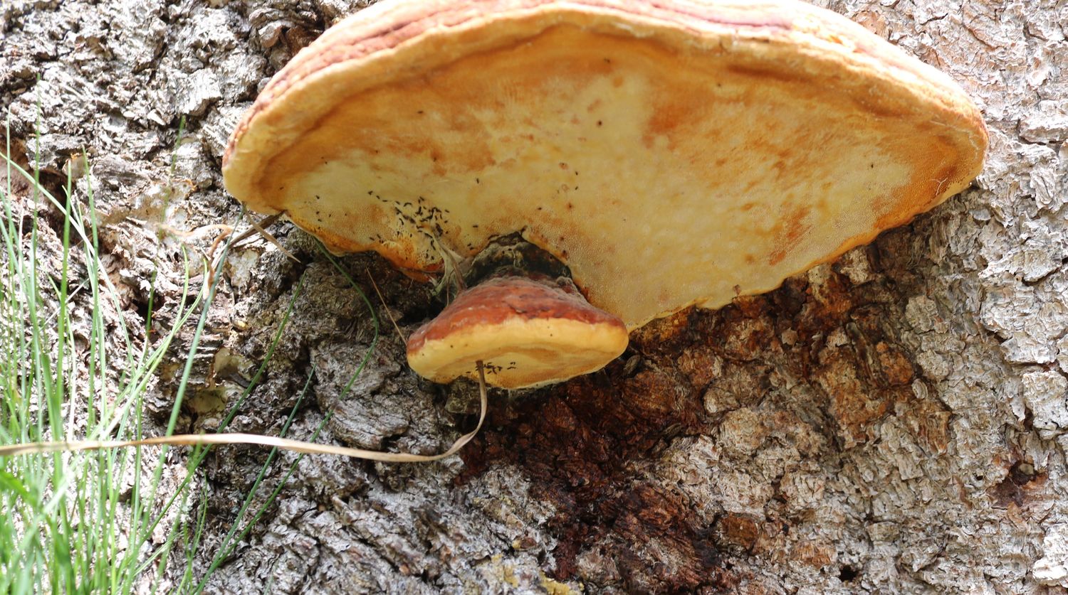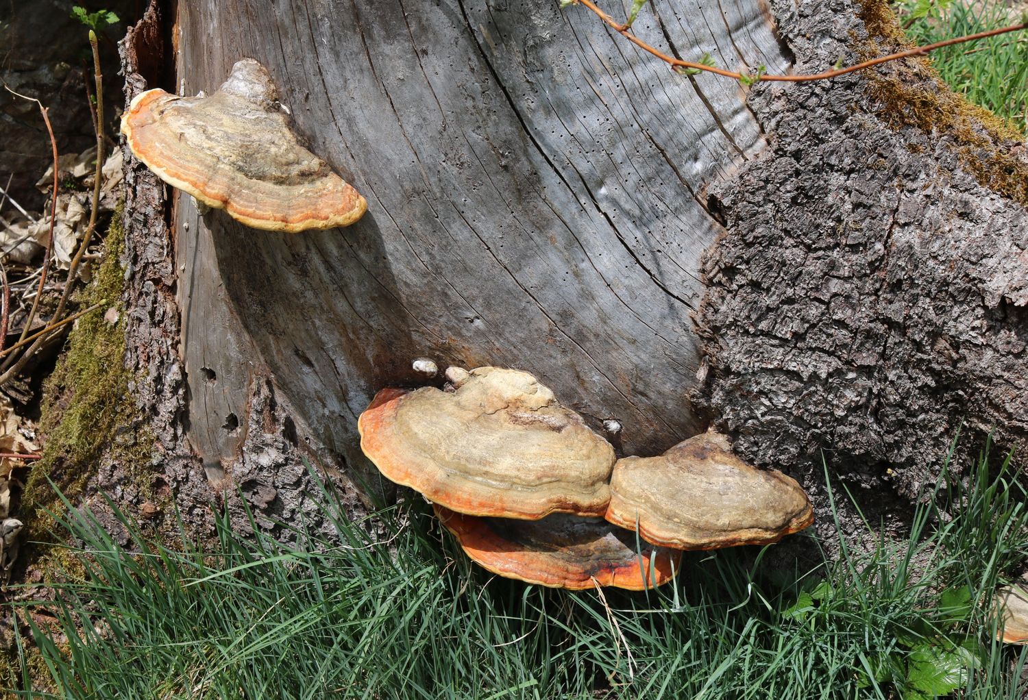 2) Das ist wahrscheinlich einfach der Rotrandige Baumschwamm. Schön anzusehen und frisch:
