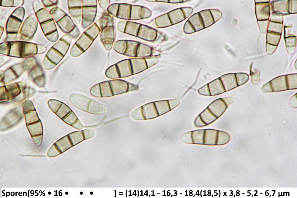 Die Gattung ist klar, aber die Art ist schwierig zu bestimmen. Entweder die Größe der Konidien passt nicht zu einer Art, die Länge der Anhängsel (bei mir bis 10 Mikrometer lang) oder das die Art 3-fach septiert ist.