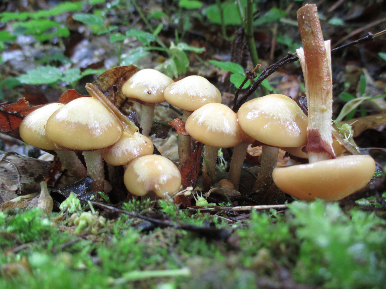 Ein paar Minuten später fand ich diese hier. Ich tippe auf Stockschwämmchen / Kuehneromyces mutabilis. Bin mir aber nicht sicher und aufgrund der Verwechslungsgefahr mit Galerina Marginata nehme ich die sowieso nicht mit.