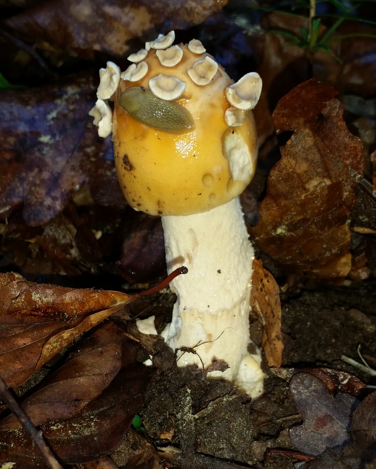 Also vielleicht doch keine ceciliae, schade. Aber für eine Amanita crocea würde ich den auch sehr ungewöhnlich finden. Mit solchen brockigen, mehrzähligen Velumplacken auf dem Hut habe ich den noch nie gesehen. Die Stielbekleidung wäre aauch ein wenig seltsam für die Art, die hatte ich bisher auch bei jungen Fruchtkörpern schon wenigstens leicht kontrastierend.