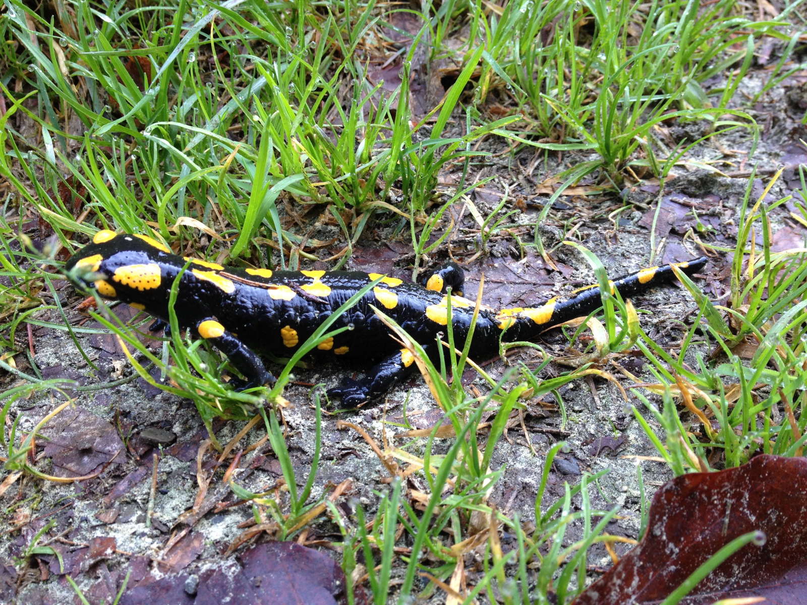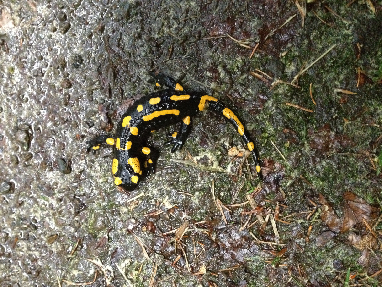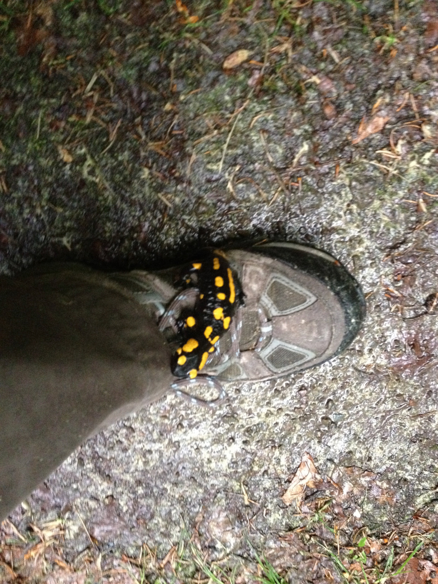 Vorgestern hatte es geregnet, prompt zeigte sich ein Feuersalamander. Da musste ein Foto sein.