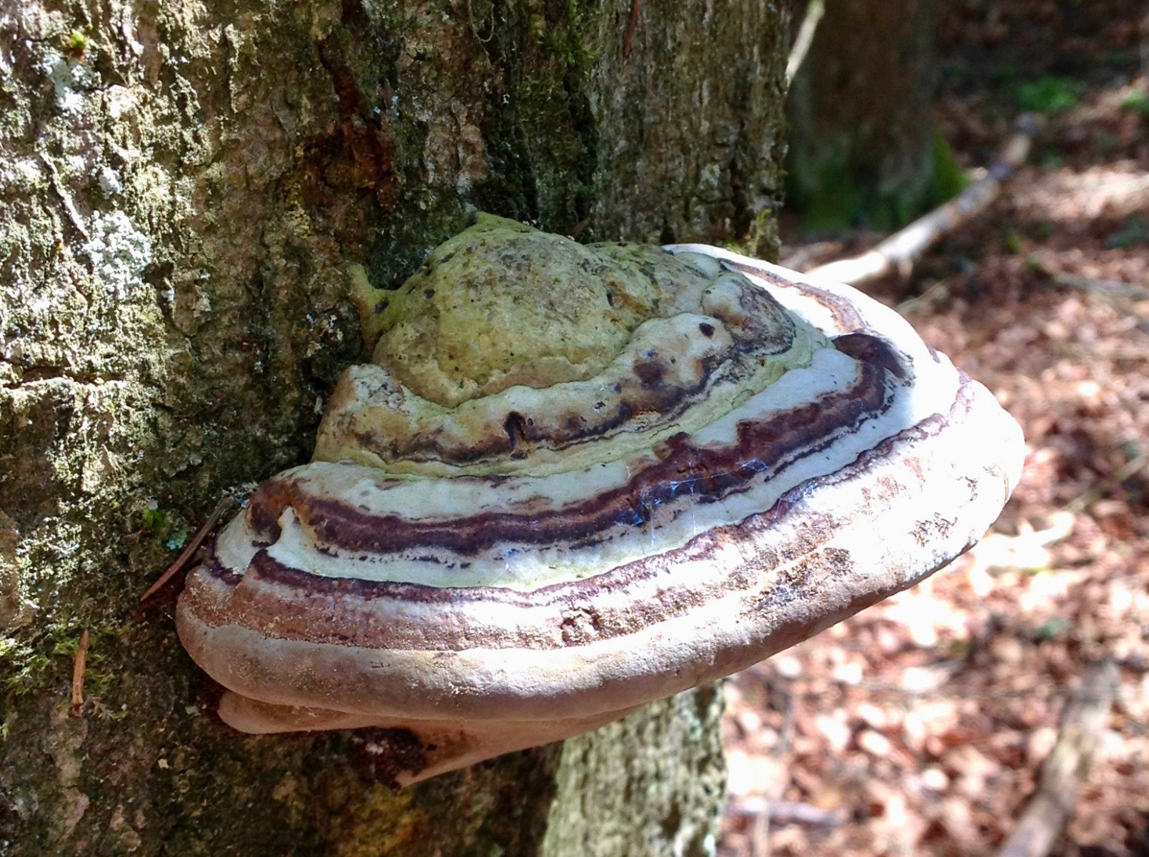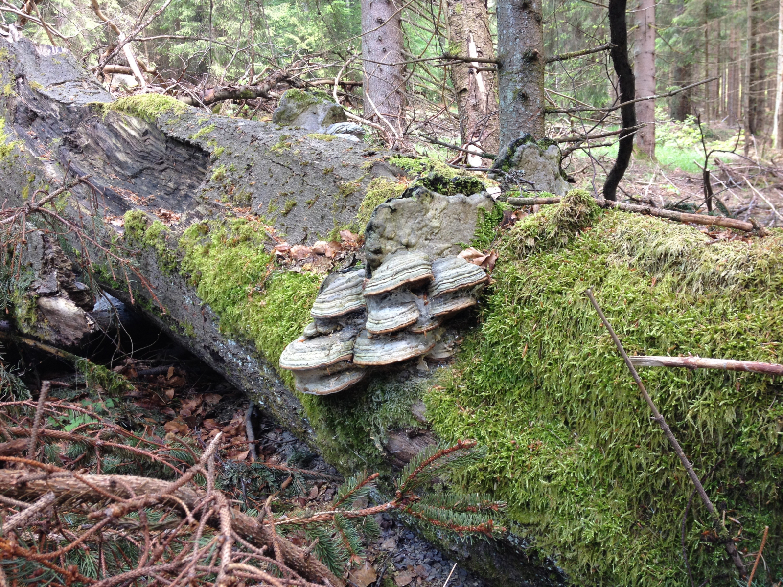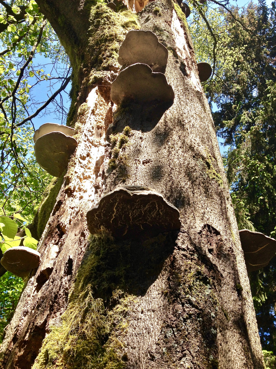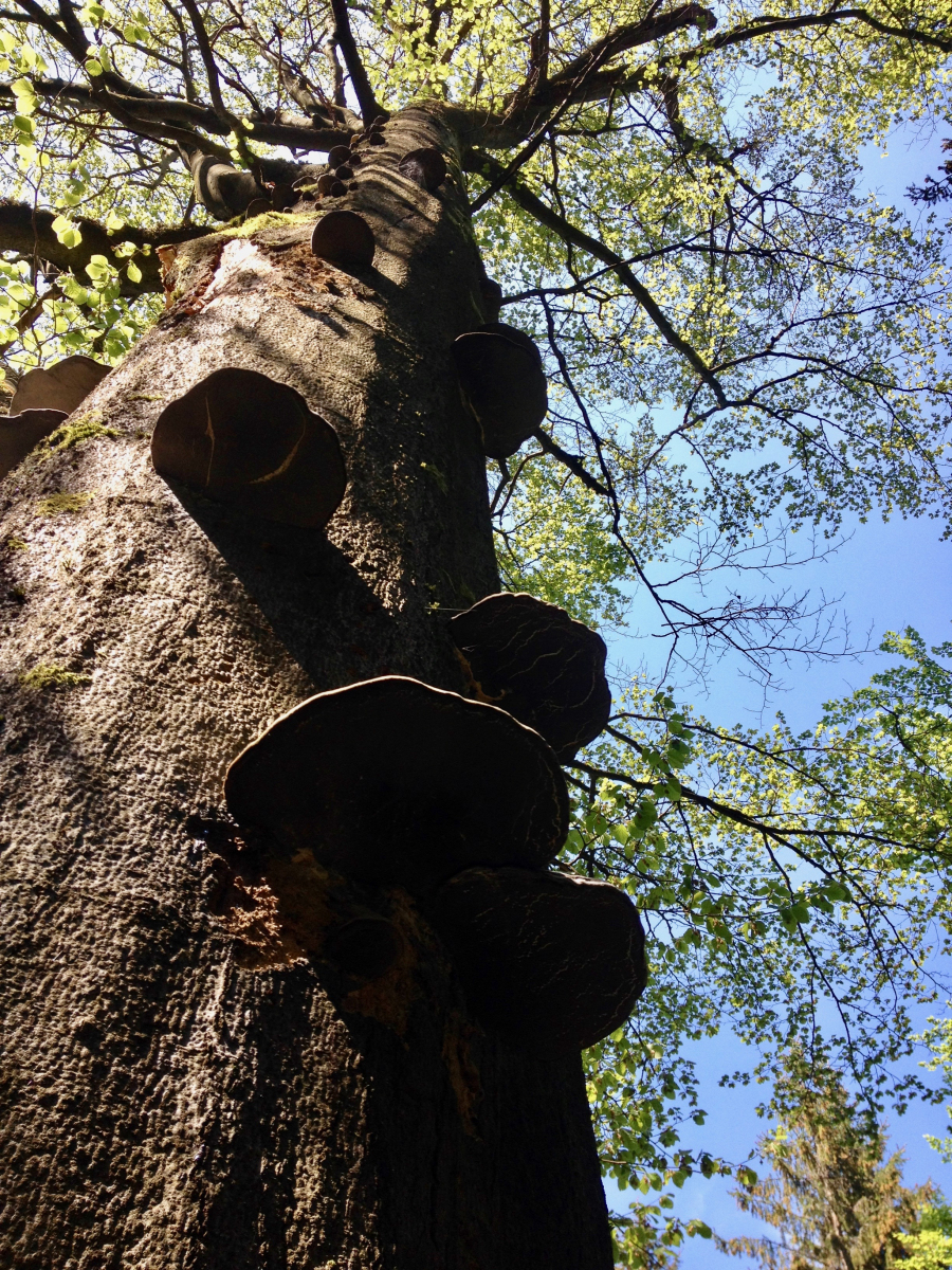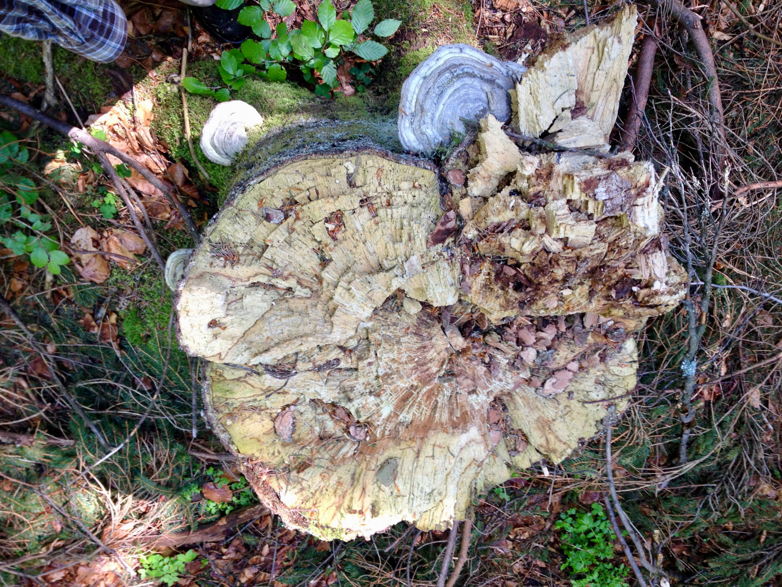 Und hier kommt das Zunderschwamm-Paradies schlechthin. Vor einigen Jahren stand die Buche noch, obwohl sie schon keine Krone mehr hatte. Dann brach sie Stück für Stück auseinander und das Pilzwachstum setzt sich an den vorhandenen Fruchtkörpern um 90 Grad versetzt fort. Schlaue Pilze, der Hut ist immer oben.