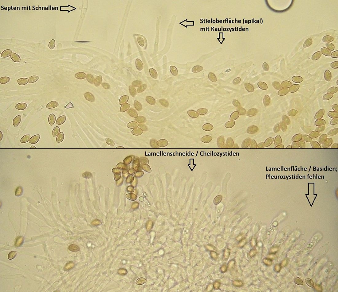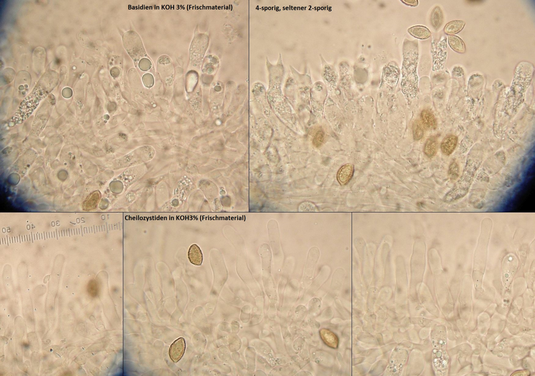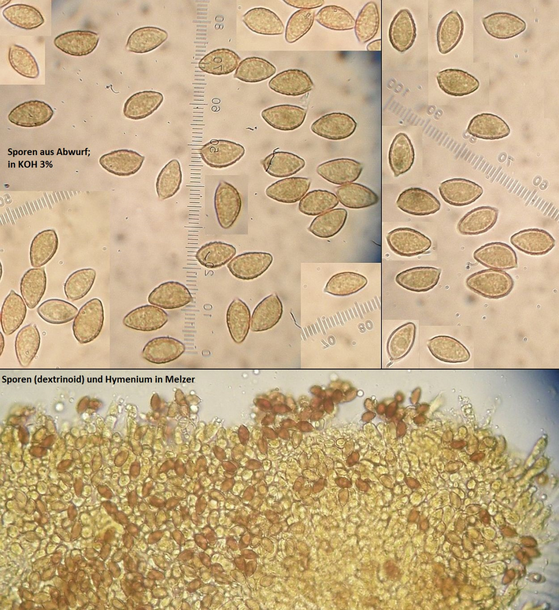 Stielspitze wirkt deutliich bereift, aber Kaulozystiden im MIkroskop eher unauffällig und spärlich. Sporen dextrinoid; so um 7,5-10 x 5,5-6,5 µm. Wo eine Skala im Bild ist, gilt 1 Strich = 1µm für das ganze Bild (also alle Ausschnitte gleich skaliert).