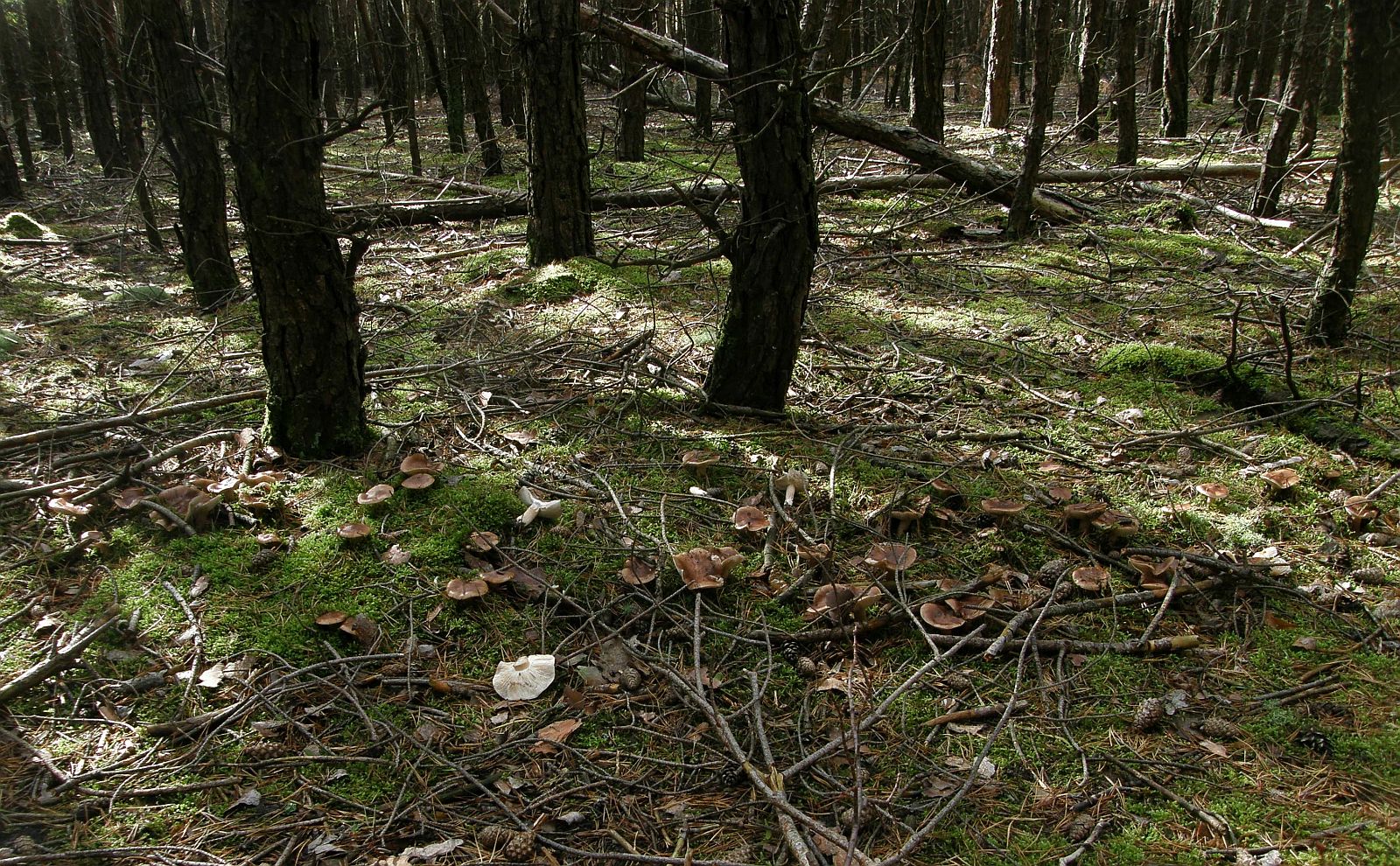 Der Kiefernwald steht recht dicht, die Kiefern sind nicht ausgewachsen, der Boden ist sehr mager und nahezu ohne krautigen Bewuchs. Ritterlingsgebiet eben.
