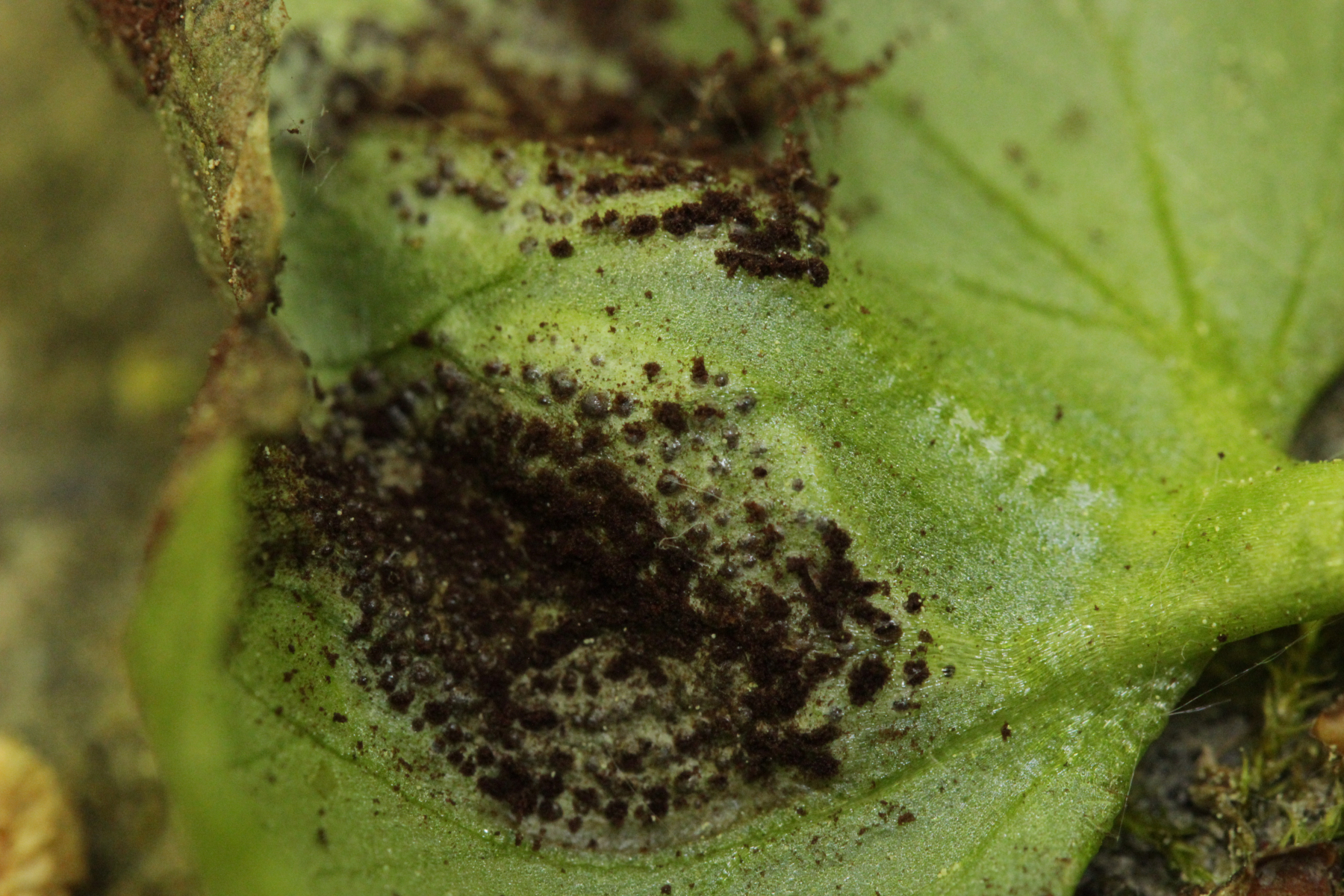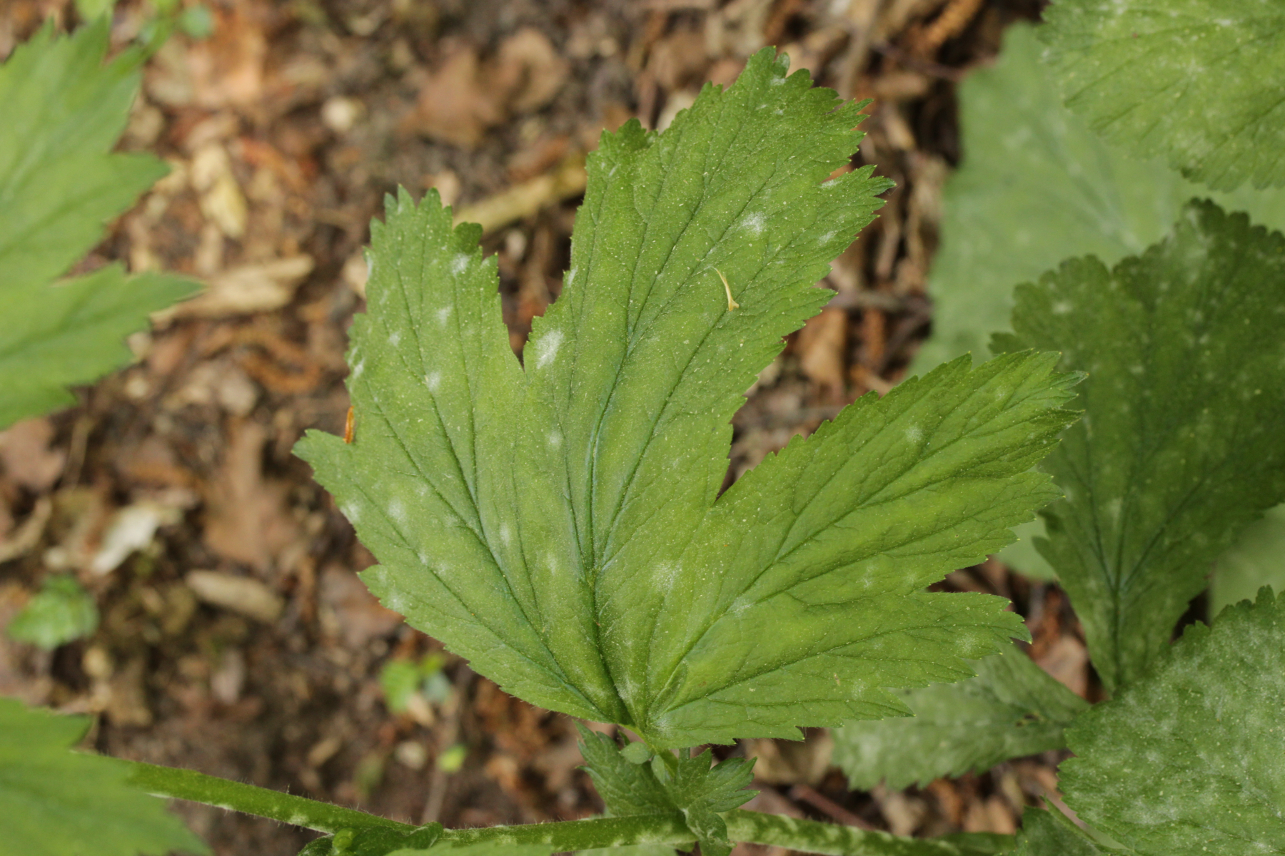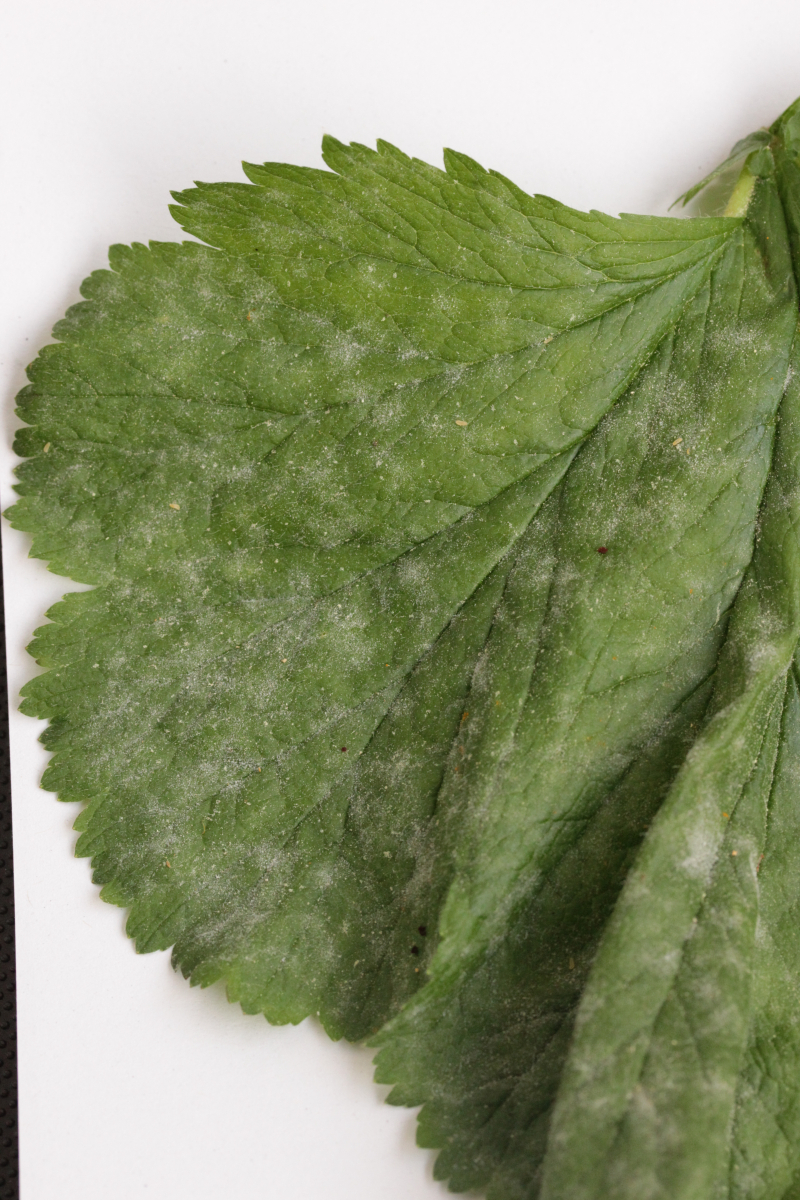 4. Podosphaera aphanis auf Geum urbanum. Außerdem noch Ampelomyces quisqualis als Hyperparasit auf dem Mehltau in Form von braunen Gebilden voller Konidien