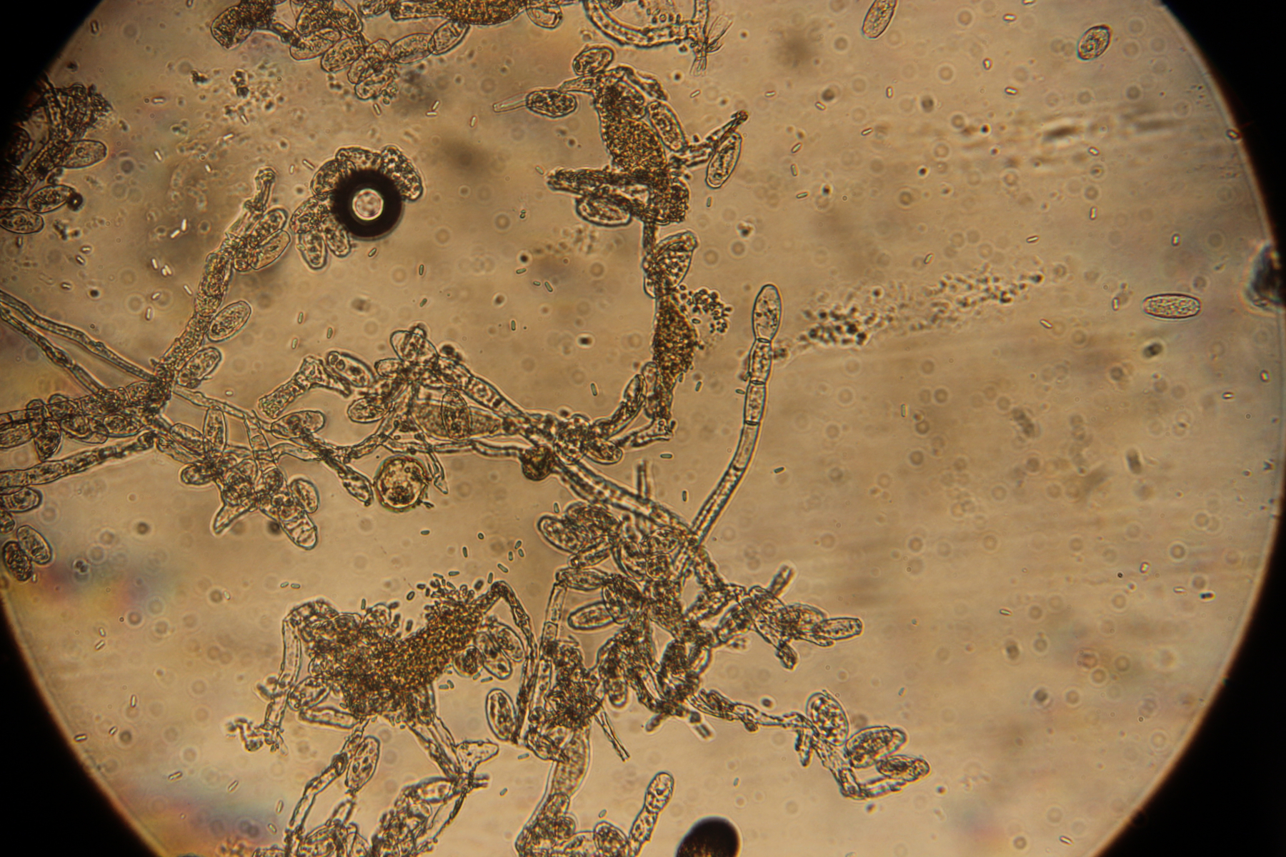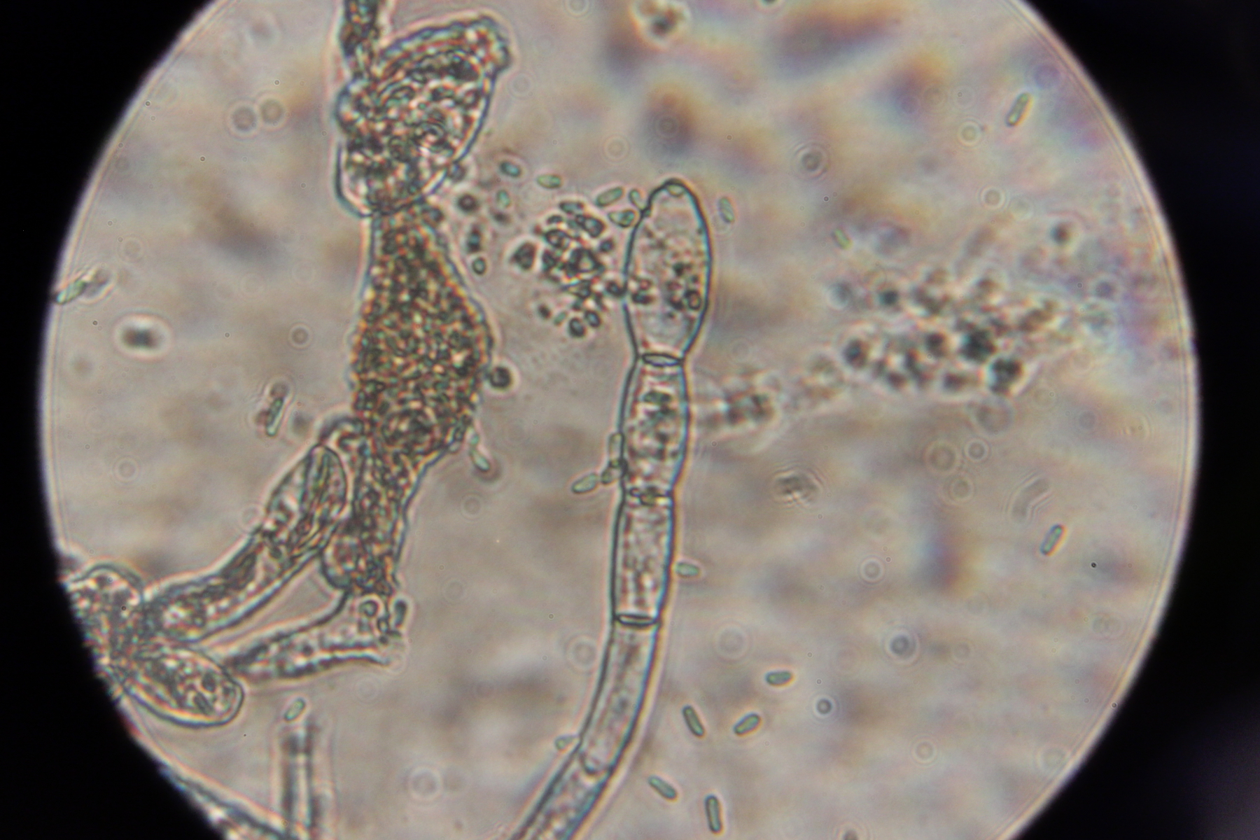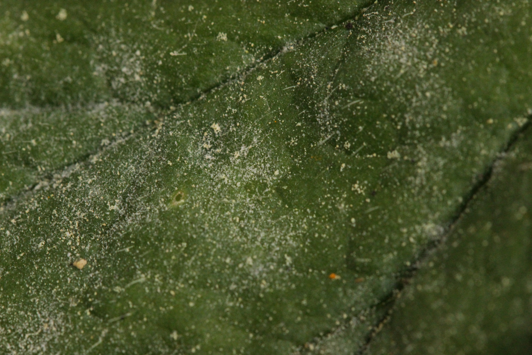 4. Podosphaera aphanis auf Geum urbanum. Außerdem noch Ampelomyces quisqualis als Hyperparasit auf dem Mehltau in Form von braunen Gebilden voller Konidien