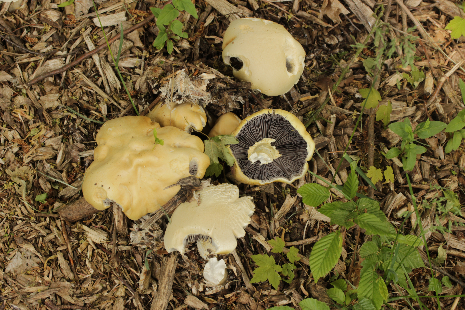 hättest du den Ring der Stropharia von oben fotografiert, wäre der Pilz wohl makroskopisch bestimmbar. Ohne die Details der Ringoberseite geht da leider nichts per Foto. Möglich wäre der Gelbe Riesenträuschling schon, aber eben nicht definitiv.