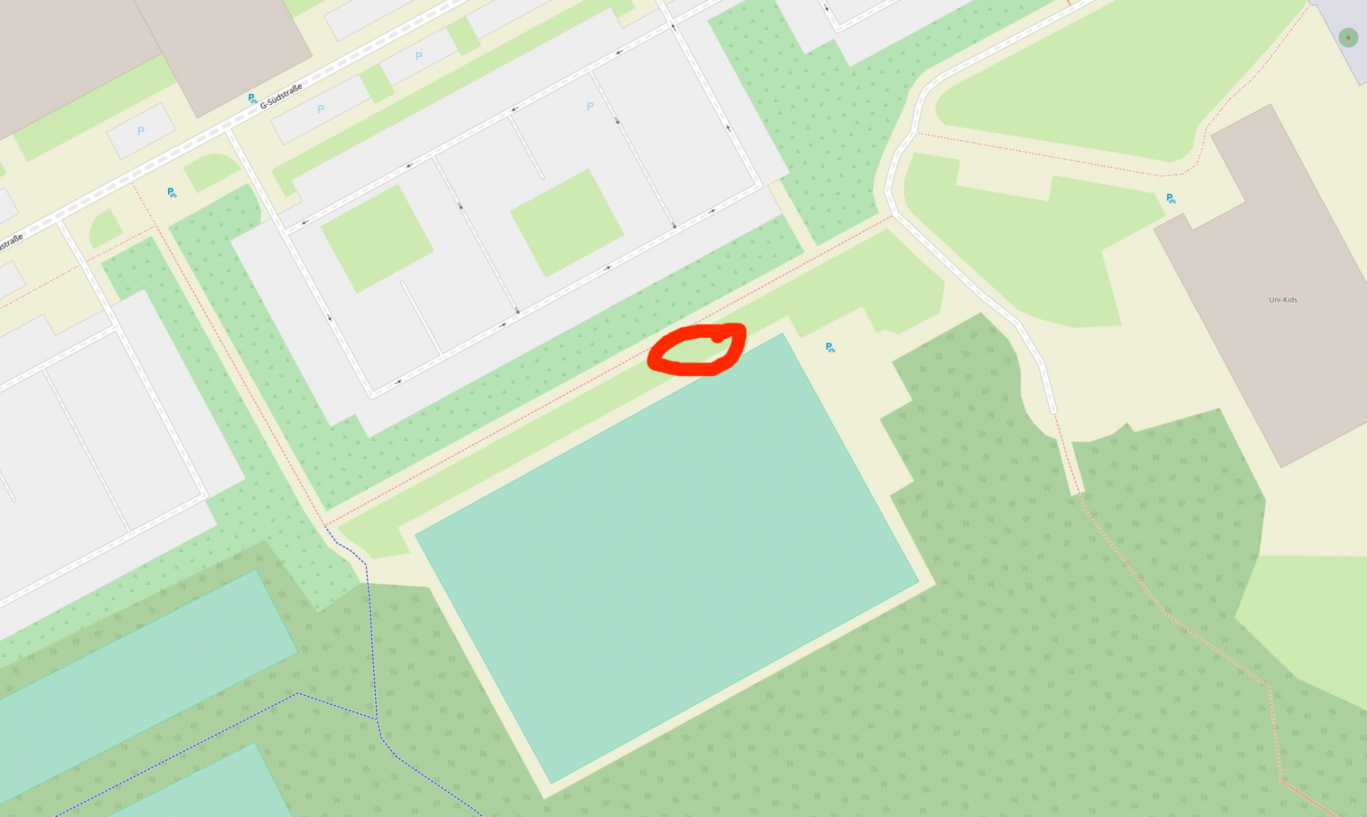 EDIT: Ich sehe gerade, daß der rote Kringel nördlich des Weges sein sollte, nicht südlich.