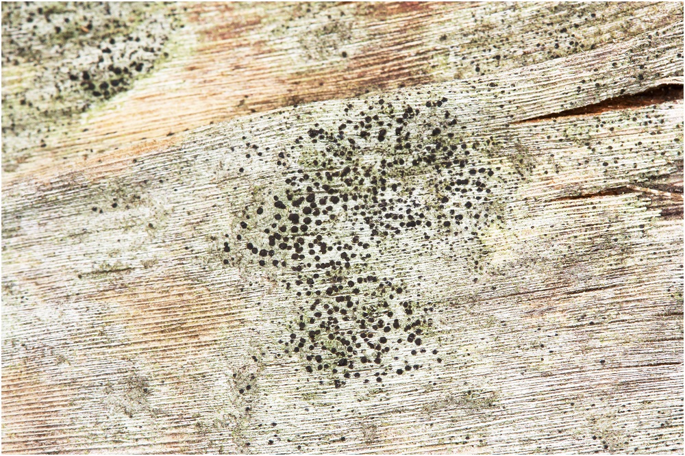 Am 11.05.18 habe ich mir dann mal ein altes vertrocknetes Blatt genauer untersucht und musste schon vor Ort feststellen das es eine Flechte ist.