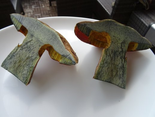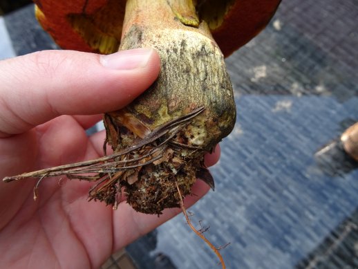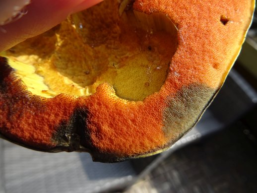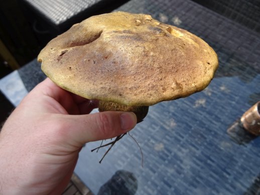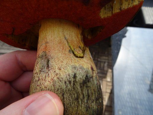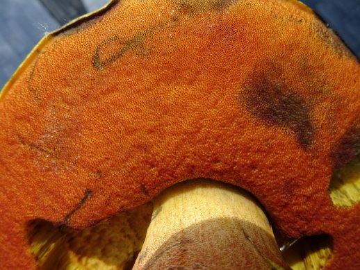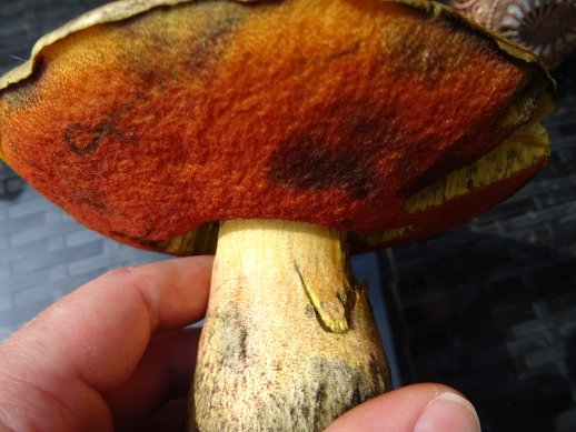 ich habe letztes Jahr mit dem Pilze sammeln begonnen und bisher die Röhrlinge mit den roten Stielen gemieden (außer Rotfußröhrlinge). Dieses Jahr will ich damit beginnen auch den flockenstieligen Hexenröhrling mit in meine Sammel-Touren aufzunehmen. Ich glaube ich bin heute fündig geworden, ich würde zumindest zu 99 % sagen das es sich um einen solchen Röhrling handelt. Der Wald hier in Rheinland Pfalz ist immer noch viel zu trocken, das war ein super Zufallstreffer. Der Pilz ist schön fest und trotz Trockenheit auch nicht ausgetrocknet.