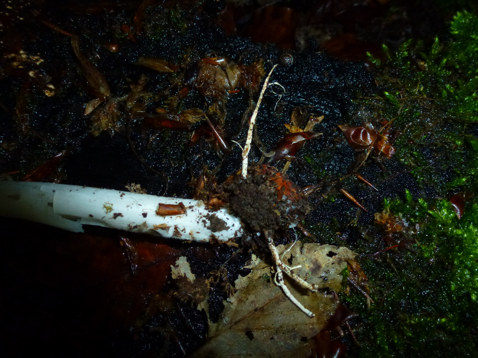 Ob er auf Holz wuchs kann ich nicht sagen, denn er steckte bestimmt 2 - 3 cm tief in der Erde bzw. unter der Blätterschicht. Das für mich auffälligste sind jedenfalls die Wurzeln.