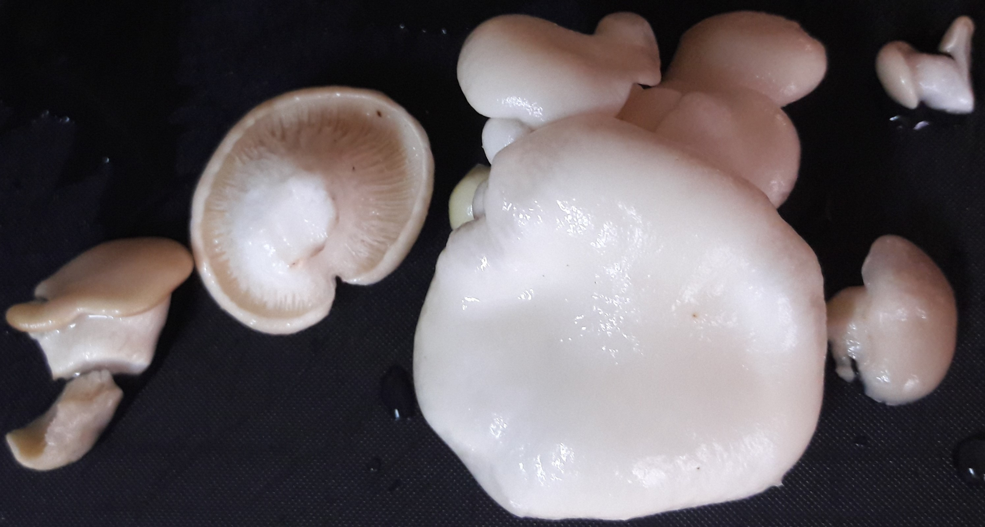 Denn diese Farbe im Abwurf geht definitiv nicht, bei keiner Pleurotus - Art. Das "bunteste" was ich je gesehen habe, war das hier:...das ist allerdings Pleurotus ostreatus. Und bei der Art ist es eben schon mal nicht immer so, sondern geht auch deutlich blasser, oder auch mehr ockerlich als violett.