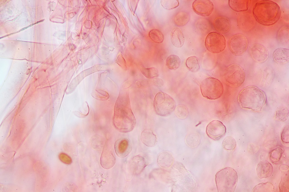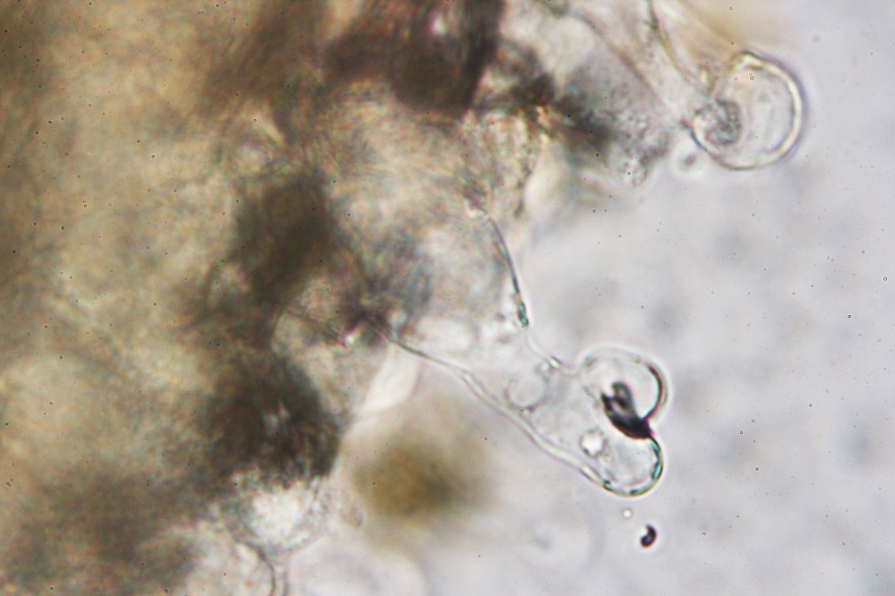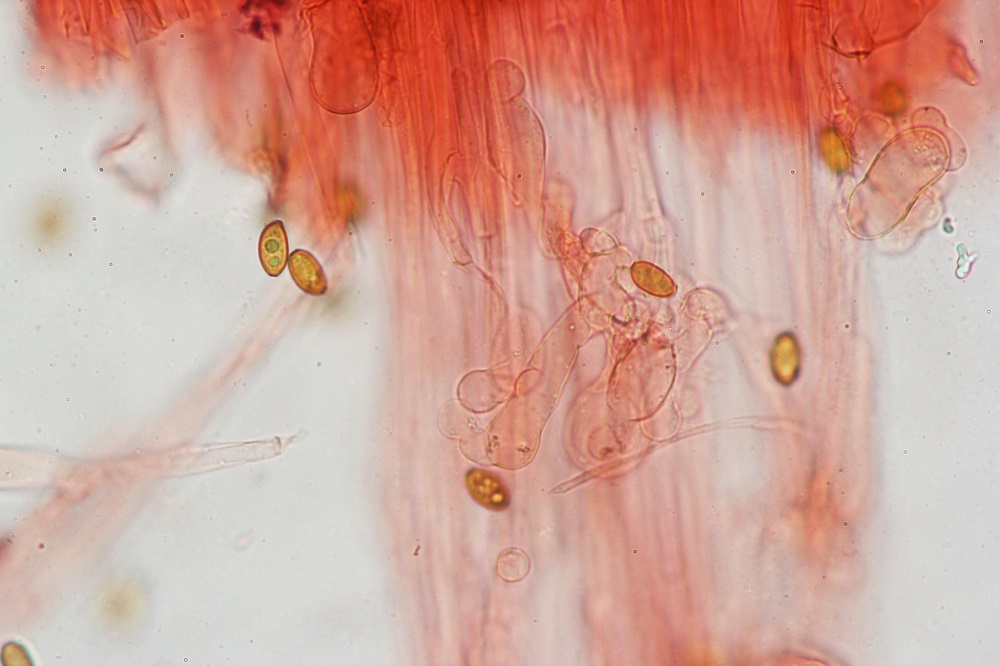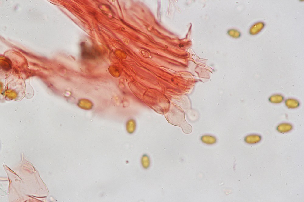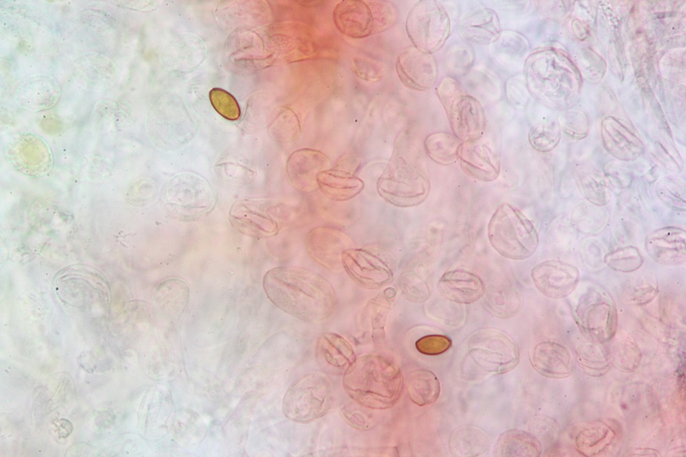 Eine dieser Pilze war der häufige Bolbitius vitellinus, den ich aus Neugier Mikroskopiert habe.