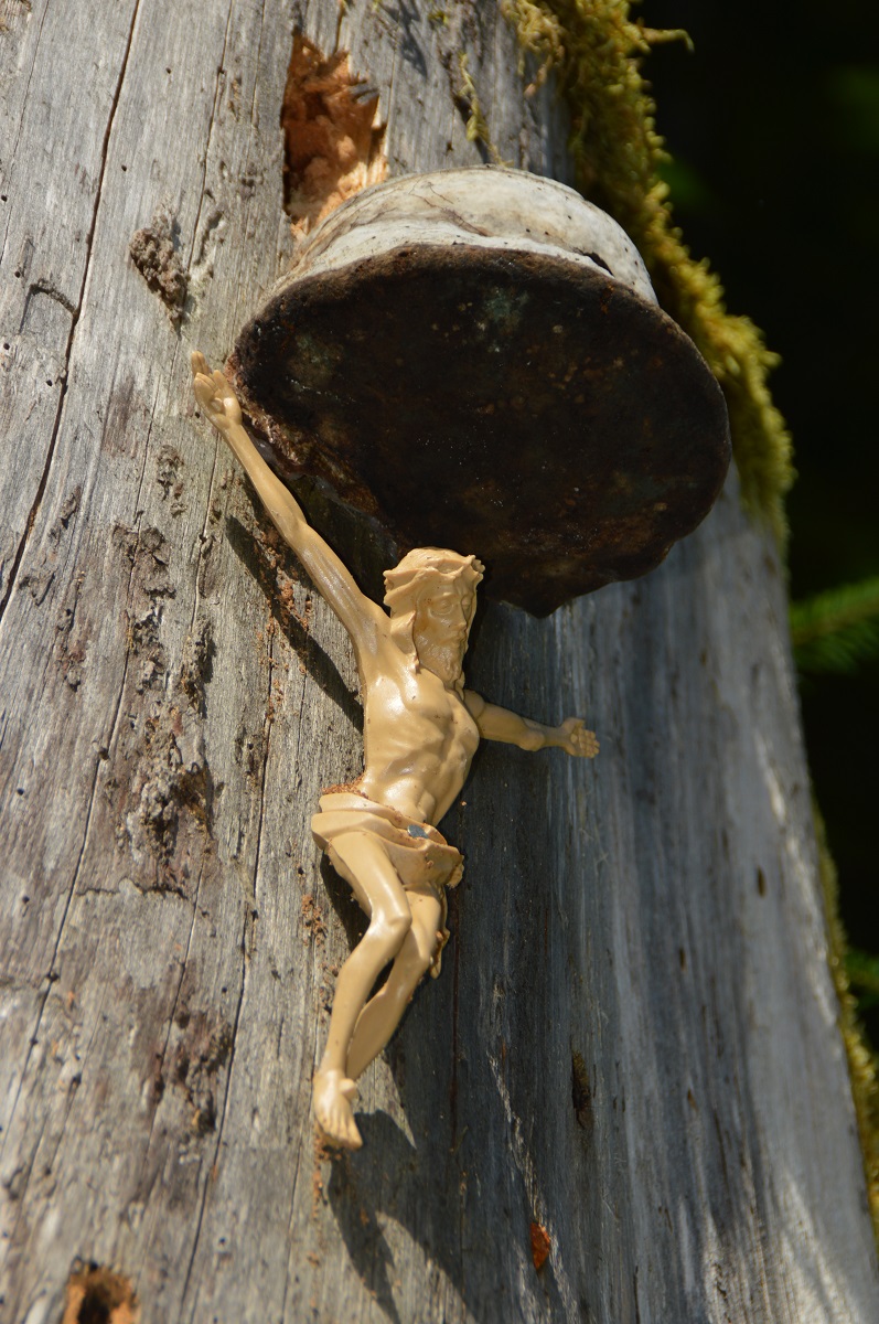 • Heiliger.... sieht eher aus, als hätten sie den Plaste-Jesus gezielt unter das "Dach" druntergehängt. Mit einem Nagel durch den Unterbauch.