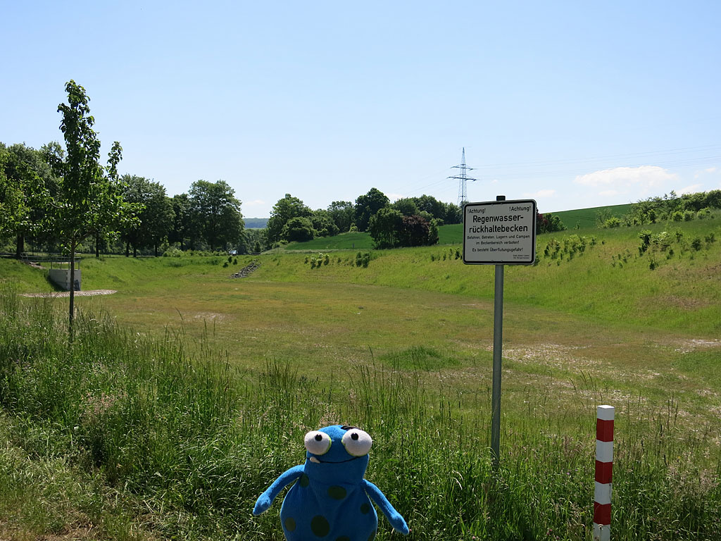 Dieses Regenrückhaltebecken habe ich noch nie voll gesehen. Muss auch nicht sein, denn Hochwasser hatten wir erst im