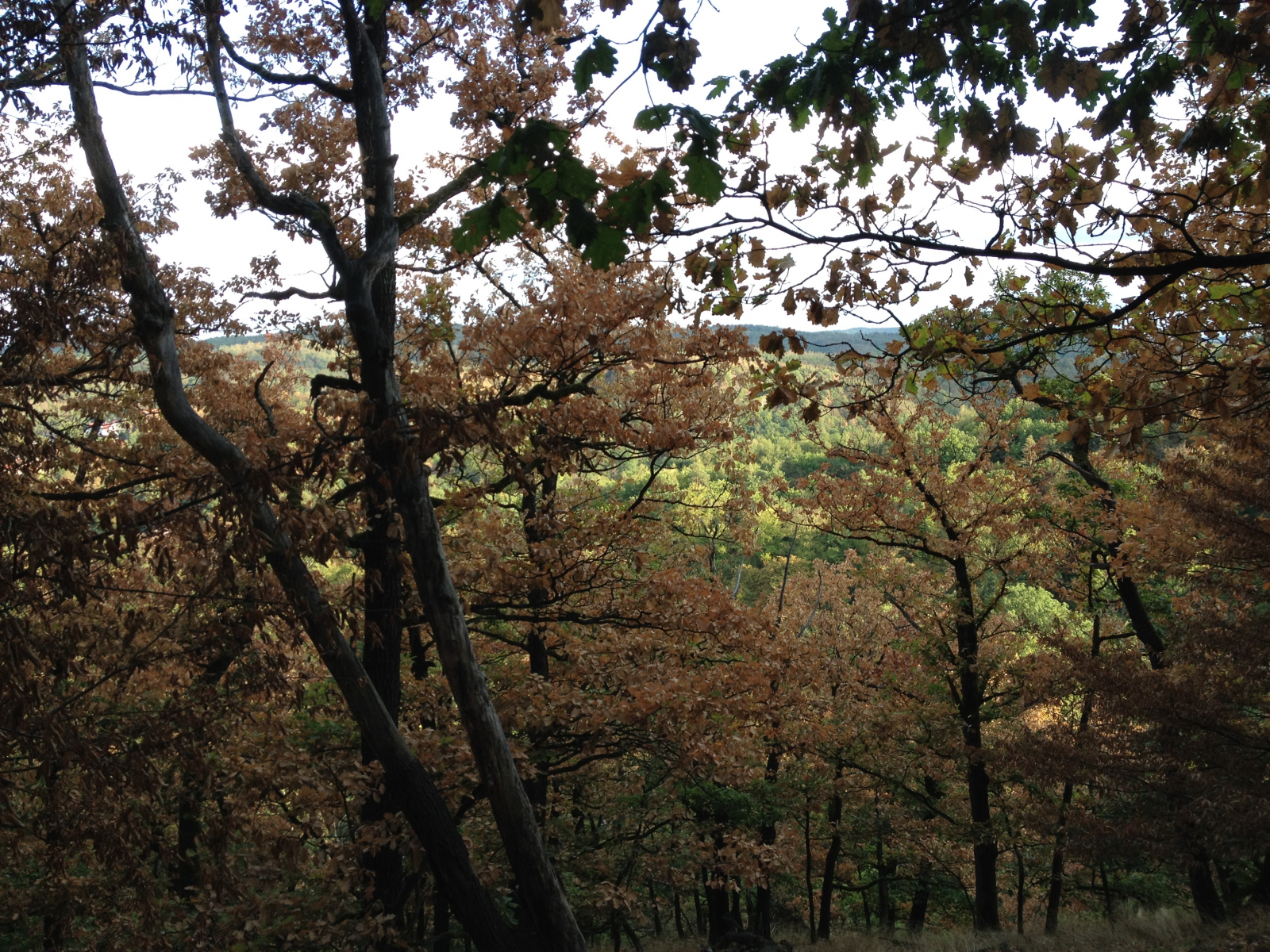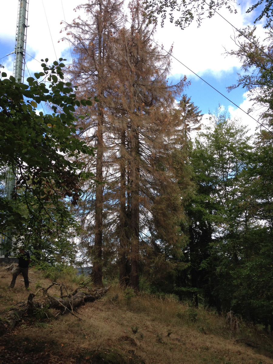 Unheimlich wird es trotzdem erst dann, wenn du Bäume mit komplett entlaubten Ästen im Kronenbereich hast, und das am Baum verbleibende Laub eine ziemlich kranke, graubraune Färbung annimmt.