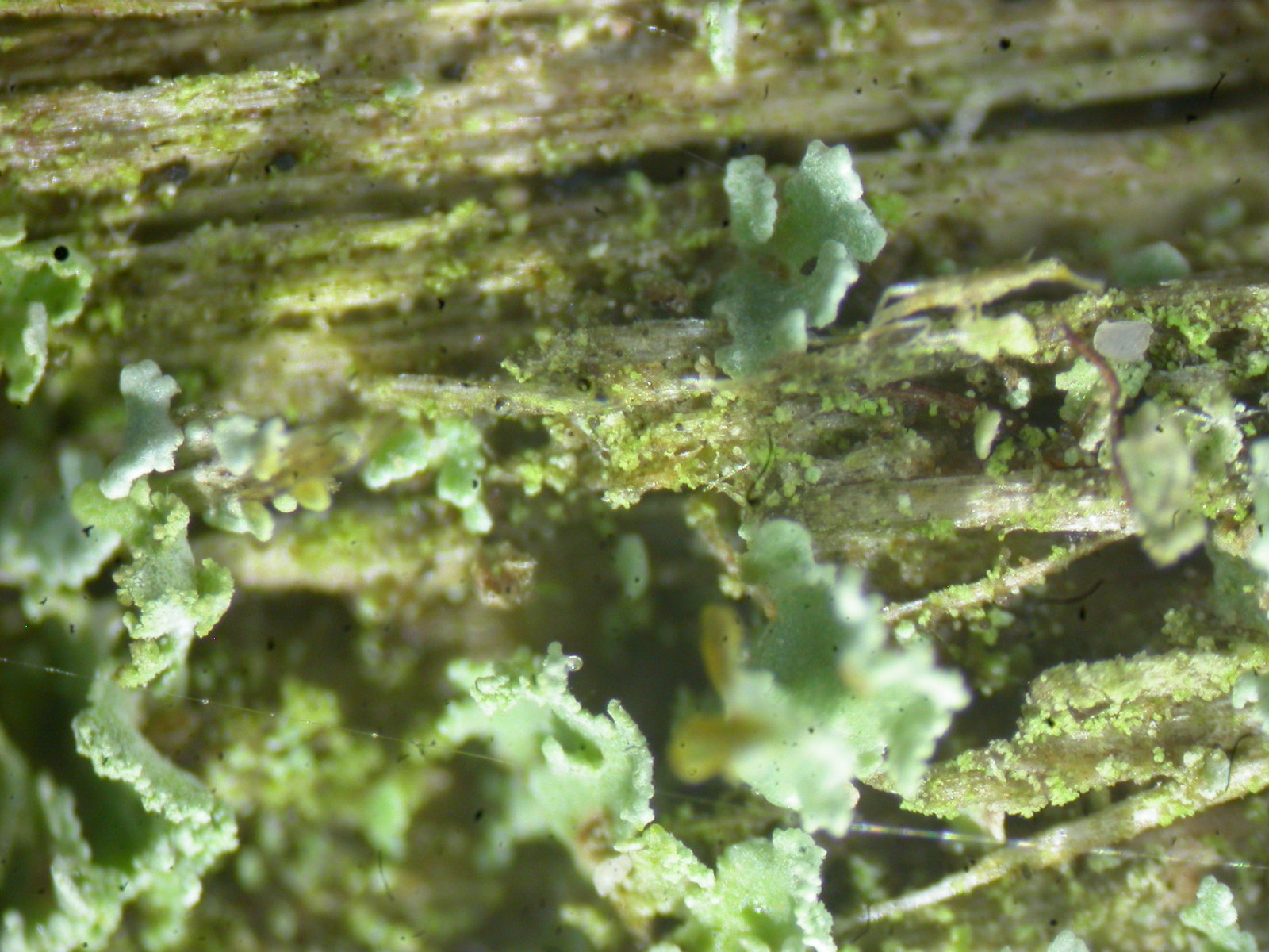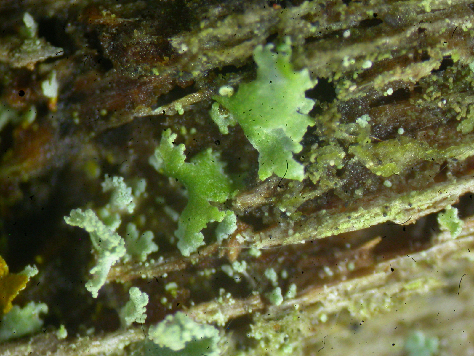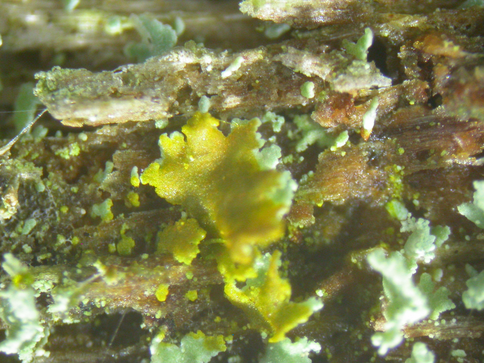 Die Flechte befand sich auf einem schon weit fortgeschritten morschen, aber noch senkrecht stehenden, -ich vermute mal Nadelbaum- der etwa noch eine Höhe von 2m hatte. Die Rinde war komplett weg und auch ein guter Teil des Kernholzes. Leider habe ich den Stamm nicht fotografiert. Aber man kann aus den Aufnahmen des kleinen Stückes, das ich am Stamm abmachte, den Vermorschungsgrad glaube ich gut erkennen.