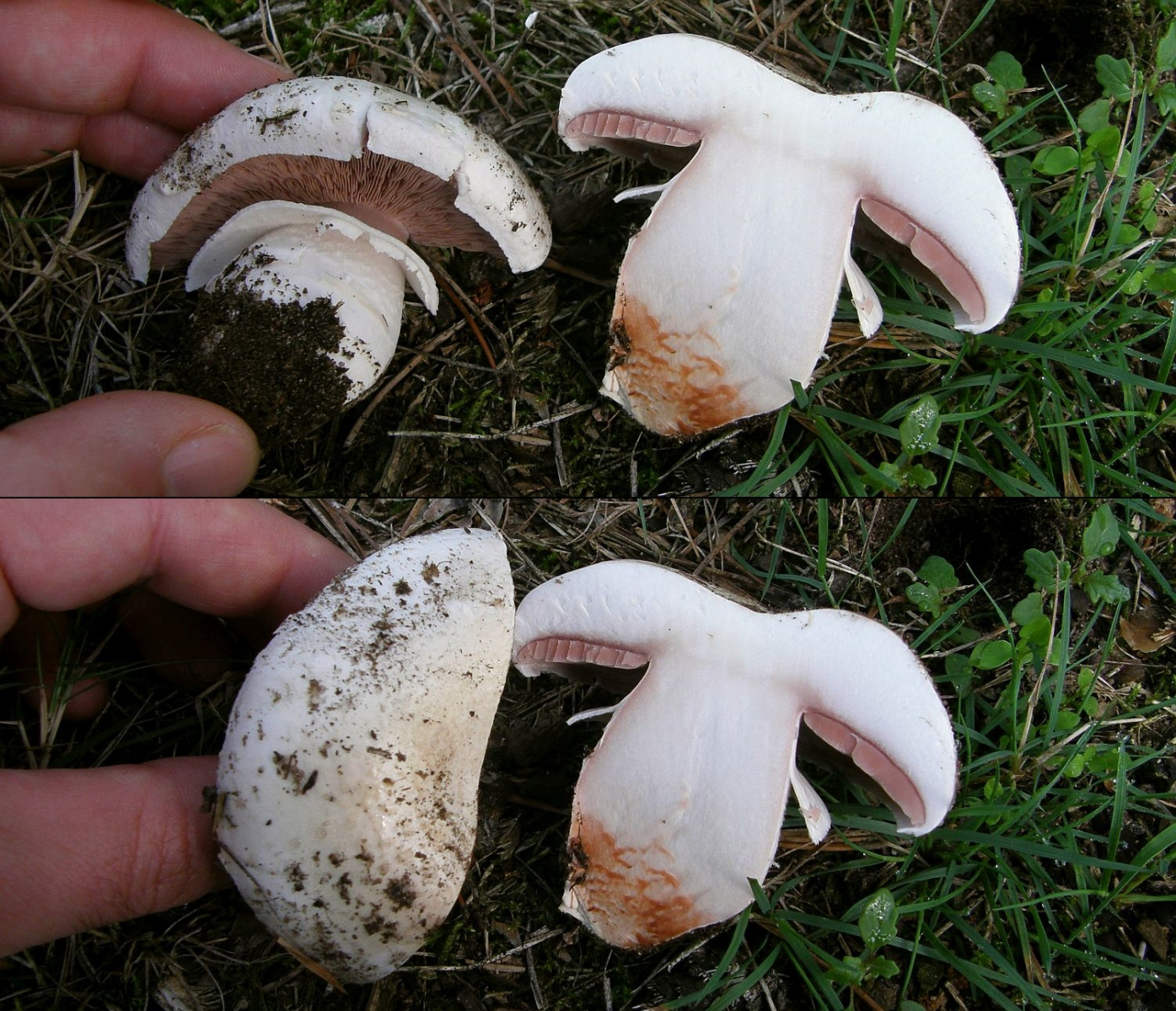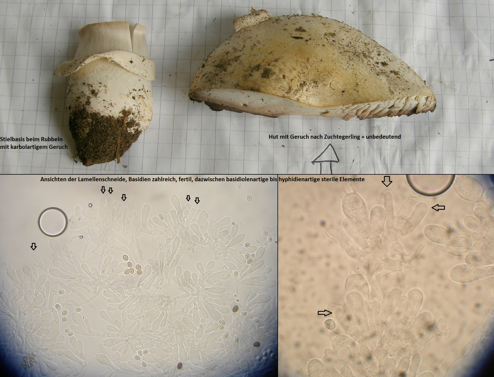 Der Fruchtkörper ist fleischig, die Hutoberfläche nach Stunden ockerlich gilbend, die Stielbasis im Anschnitt erst für vielleicht 1 Sekunde gelblich, dann orangerötlich. Der Geruch ist interessant: Im Schnitt riecht die geriebene Schnittfläche im Hutbereich unbedeutend, also quasi nach Zuchtegerling. Die Stielbasis riecht jedoch im Schnitt (beim Rubbeln der Schnittfläche) deutlich Jodartig (=Desinfektionsmittel, Krankenhaus, "Karbol").